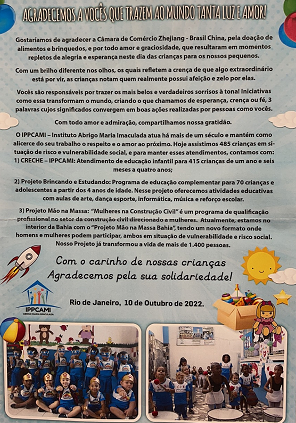浙江商会会长郑侠茂说:“巴西是我们长期生活、工作的第二故乡,和巴西人共建美好家园是我们的责任,回馈当地社会更是我们的义务。巴西受疫情的影响,贫富差距越来越大,贫困家庭难上加难,今天我们商会为这些孩子进行儿童节捐赠,希望孩子们儿童节快乐!”