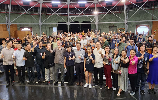 结束剧院的参观后,陈总领事来到排练大厅,观看实验曲目交响乐团的排练。当天,交响乐团首先演奏了巴西和中国国歌,接下来是交响乐团伴奏的二胡独奏《梁祝》,随后四位华人艺术家在交响乐团的伴奏下,合唱《友谊地久天长》。