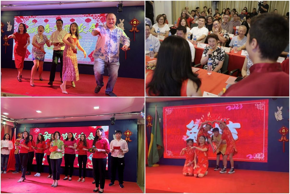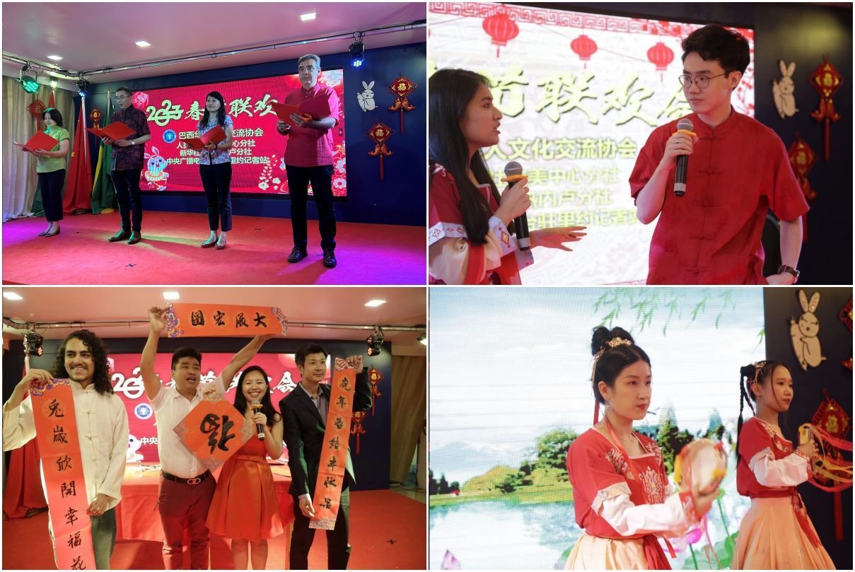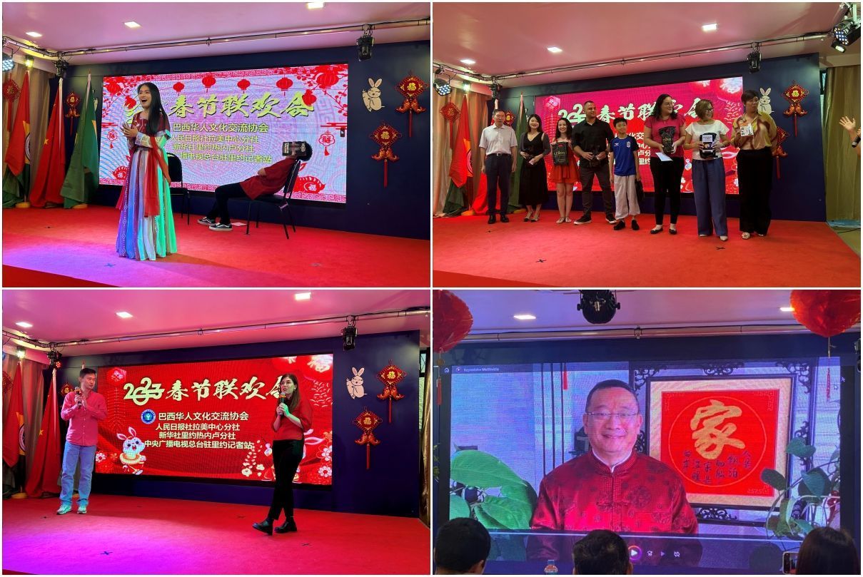 【南美侨报网讯】春节期间,巴西华人文化交流协会(以下简称文协)在文协会馆与人民日报社拉美中心分社、新华社驻里约分社、中央广播电视总台驻里约热内卢记者站联合举办里约华侨华人的“春晚”,此次春节联欢活动是里约侨界三年来首次举行的春节庆祝活动。中国驻巴西里约总领馆田敏总领事、人民日报社拉美中心分社吴杰社长、新华社驻里约分社首席记者赵焱老师,里约总领馆王慰育副总领事以及巴西中国问题专家、巴西友人、央媒记者、里约华人联谊会陈秉文会长、里约中国和平统一促进会魏贵鹏监事长、巴西中国和平统一促进会王俊晓会长、巴西中国浙江商会郑侠茂会长、里约广东同乡会陈士俊代会长等出席了本次春节联欢活动。活动由秘书长伍小曼、网红王伊立等联合主持。