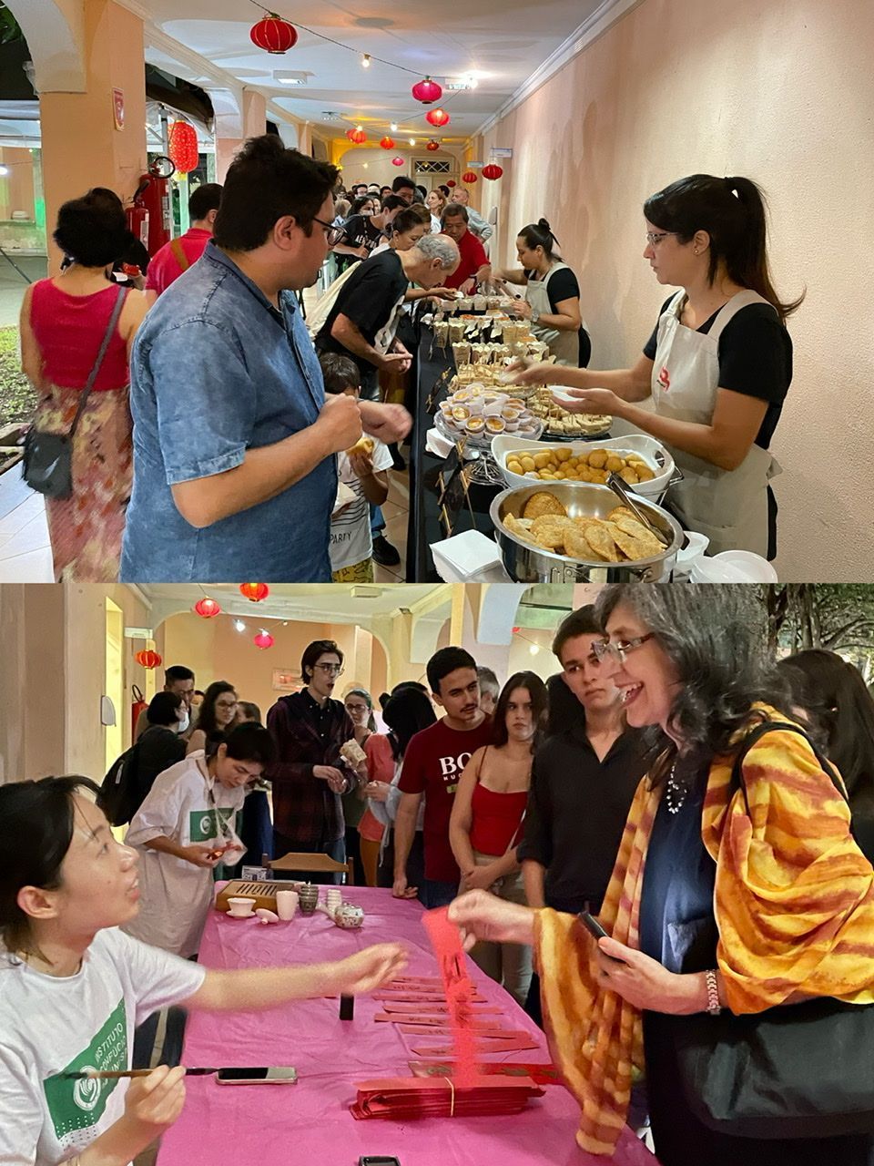 开学典礼仪式结束后举行了开学联欢会。联欢会上,孔院组织了各种有趣的活动和互动环节,例如小吃品尝、剪纸、书法、茶艺、小提琴演奏和互动游戏等。