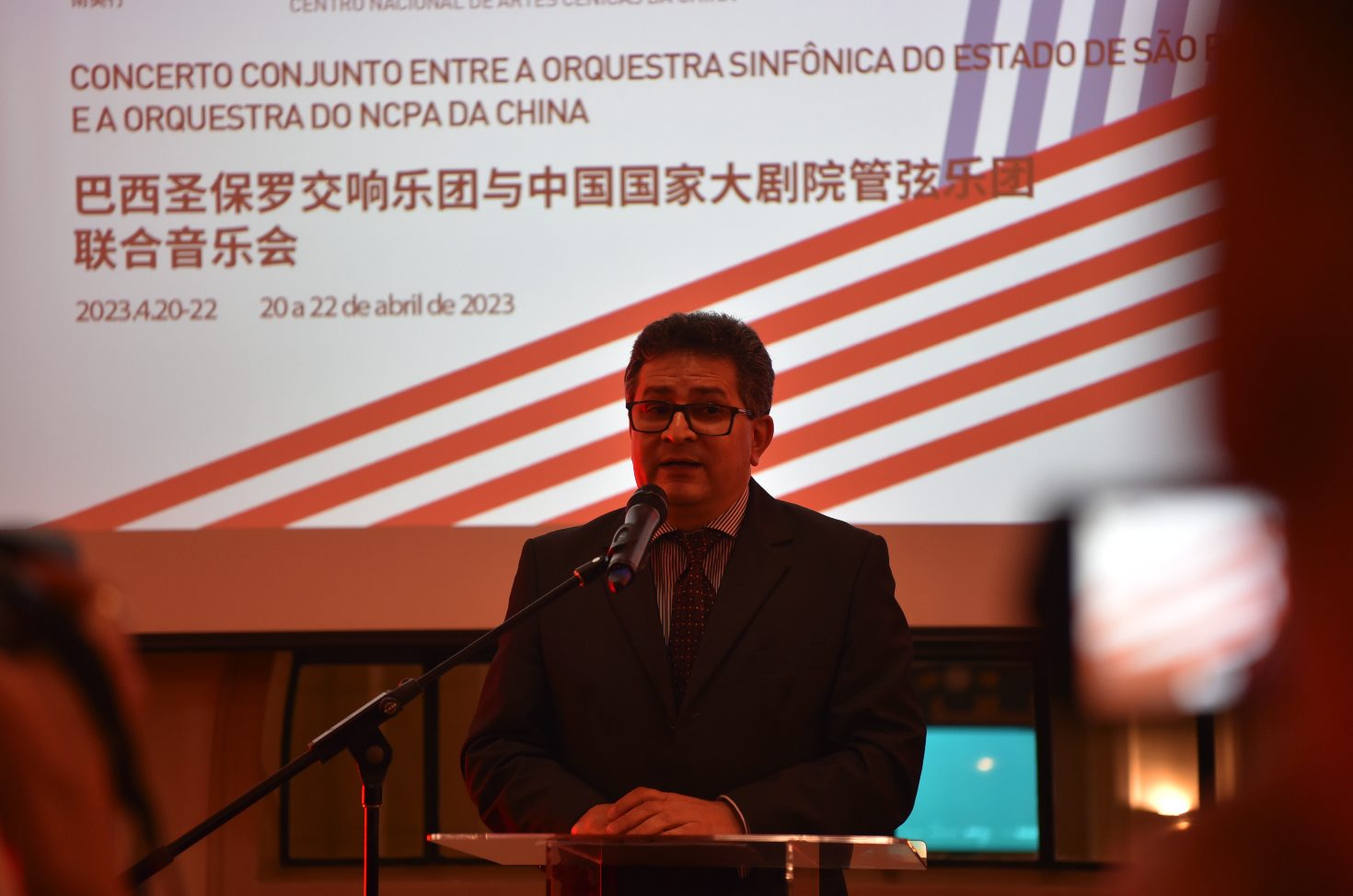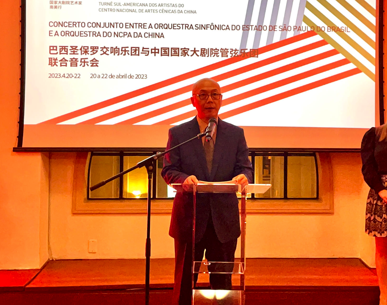 赵铁春副院长受国家大剧院王宁院长委托率团访问圣保罗。致辞中他指出,这次访问意义特殊,不仅是国家大剧院代表团首次访问南美,国家大剧院管弦乐团音乐家首次在南美演出,也是疫情后的首次海外演出。演奏家们通过这几天排练、交流、切磋,他们已然成为了音乐知己和好朋友。他表示,相信从今晚开始,两国音乐家一连三晚,在见证巴西深厚历史,象征巴西充满活力,由巴西老火车站创造性改造而来的圣保罗音乐厅里,为圣保罗的观众奏响中国和世界经典曲目,用音乐的语言和力量一定会更加增进中巴人民的了解和友谊。以此来展现“文明互鉴,艺术互通,携行致远”的目的。