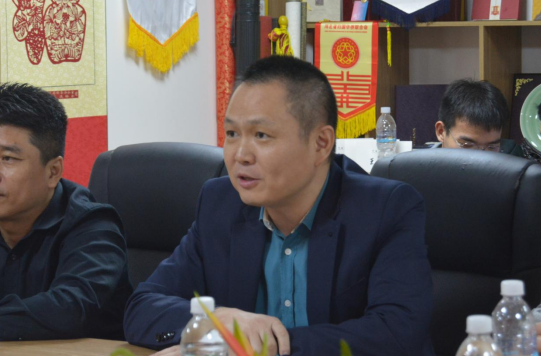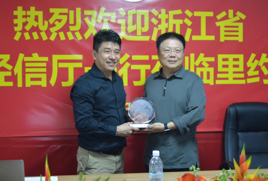 巴西中国浙江商户会长郑侠茂与浙江省经济和信息化厅副厅长厉敏互赠礼物留念