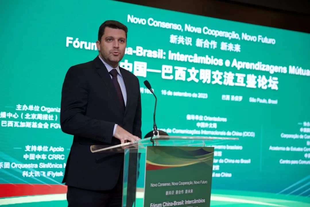 【南美侨报圣保罗记者戴萌报道】9月16日,第二届中国—巴西文明交流互鉴论坛在巴西圣保罗举行。论坛主题为“新共识、新合作、新未来”。中国外文局副局长刘大为、巴西文化部国际事务特别顾问总协调员维尼修斯·古特勒·罗萨(Vinicius Gurtler da Rosa)出席论坛并致辞,中国政府拉美事务特别代表邱小琪、中国驻巴西大使祝青桥、巴西驻华大使高望发表视频致辞。中国中车董事长孙永才、中国美术馆馆长吴为山、巴西瓦加斯基金会法学院国际交流部主任罗德里戈·维安那(Rodrigo Vianna)作大会发言。中国驻圣保罗副总领事田玉震等中巴政府、智库、媒体、青年代表约100人出席活动。