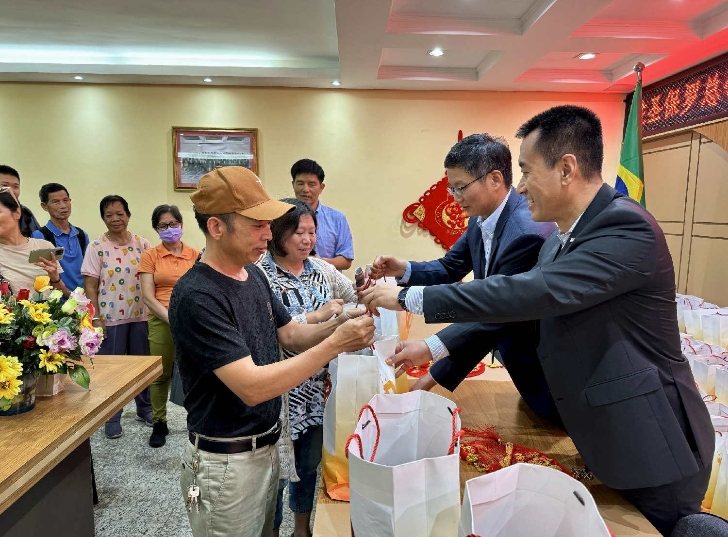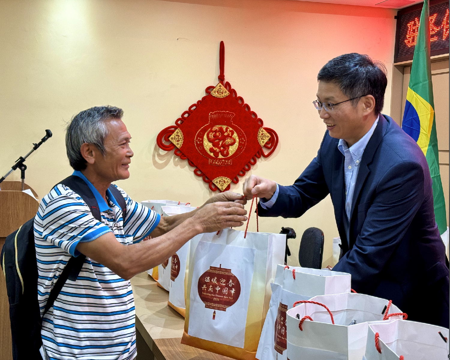 派发现场,余鹏与田玉震热情的将“春节包”递给前来领取的较为年长的侨胞手中。余鹏在接受采访时谈到,此次在春节之际向侨胞派发“春节包”的活动,正体现了我们扶危济困、守望相助的传统美德。他表示,这些“春节包”的发放旨在为那些有需求的侨胞送关爱,同时传达出祖国人民对于巴西华侨华人的深切关怀与祝福,希望能让每一位侨胞都能享受到一个充满幸福与温馨的春节。