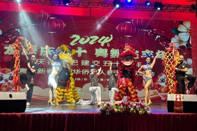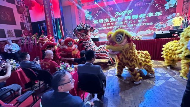 大红的灯笼、巨幅的春联让活动现场充满中国春节的气氛。锣鼓响起,两条金龙在舞台上起伏飞舞,几头彩色的狮子在席间跳跃欢腾,余鹏总领事亲自为舞狮派发红包,寄寓对新的一年的美好期许和对圣保罗华侨华人的美好祝愿。在雄壮的中巴两国国歌声中,联欢晚会拉开序幕。
