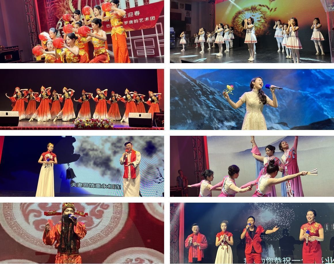 晚会上,精彩纷呈的文艺表演彰显了圣保罗浓厚的艺术氛围和中华文化的独特魅力,开场舞《金龙迎春》、歌曲《欢乐年年》《海阔天空》《PRA VIDA INTEIRA》、《恭喜发财科目三》、女声独唱《攀登者》、舞蹈《我的新衣》《越歌行》《唐宫少女》《雨涧春行图》《绽放》、粤曲《花好月圆》。其中舞蹈《雨涧春行图》以诗意入舞,追逐山的重叠,水的回环,雨的春意,隐隐青山,迢迢碧水,表现少女们撑伞而行、沐雨而归的情景,在大自然的晕染下,融汇成一幅秀丽的山水长卷。《桑巴龙狮庆春节》将巴西的桑巴与中国传统舞龙舞狮相结合,当桑巴遇到舞龙舞狮,桑巴舞的激情和动感,漂亮的服饰;舞龙舞狮的力量、热闹和祥和;两者的神韵配合完美,狂欢加上吉祥喜庆,展现出中巴两国文化的交融,为观众带来全新的视听享受和新春的祝福。大合唱《朋友》将现场气氛推向高潮。大家共同欢庆,祝愿中巴友谊长存,祖国繁荣昌盛。