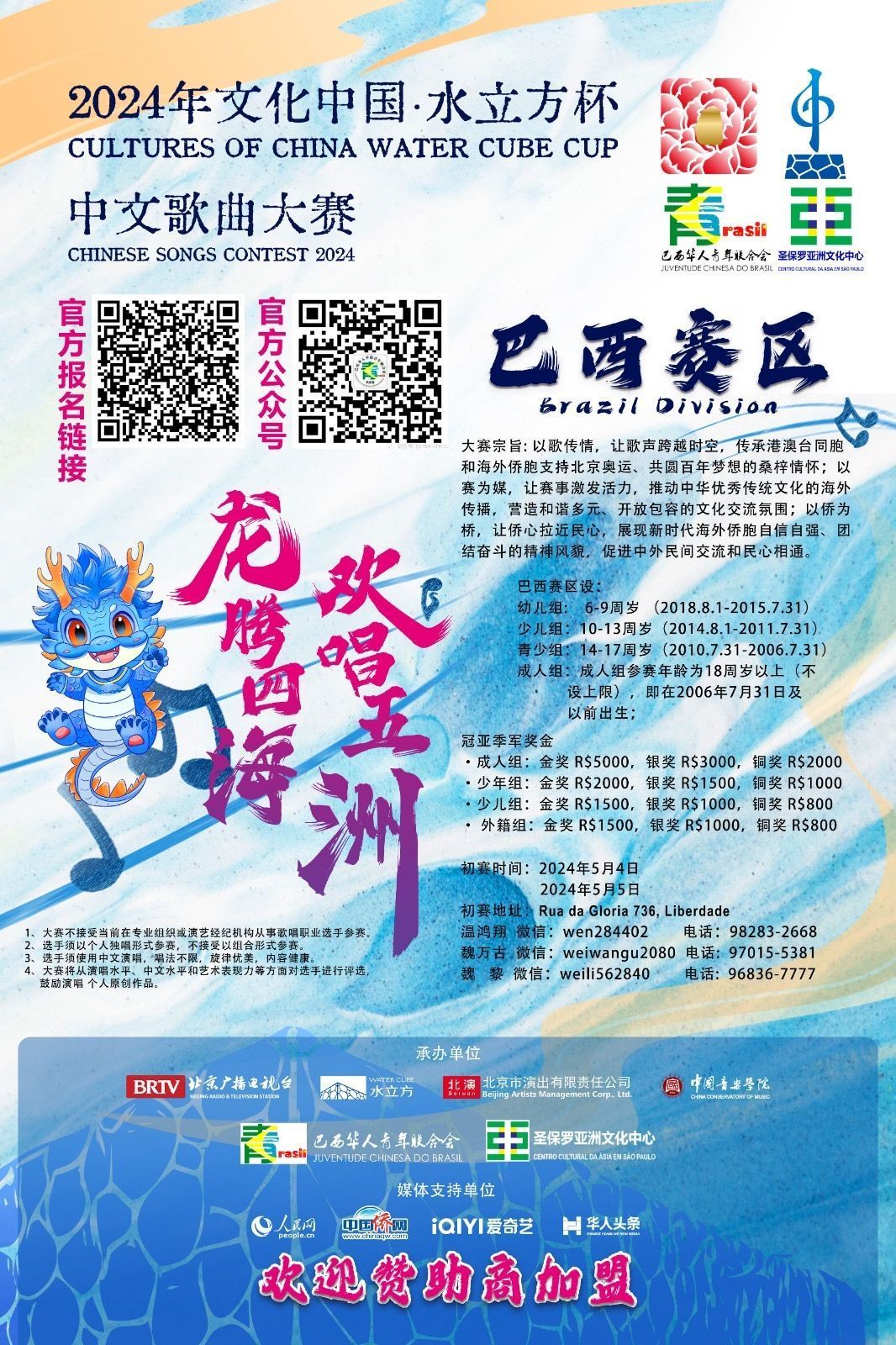 【南美侨报网讯】龙腾四海,欢唱五洲,全新的赛制,丰厚的奖金,新的征程,新的起点,2024年文化中国·水立方杯中文歌曲大赛巴西赛区火热报名中,欢迎大家踊跃报名!