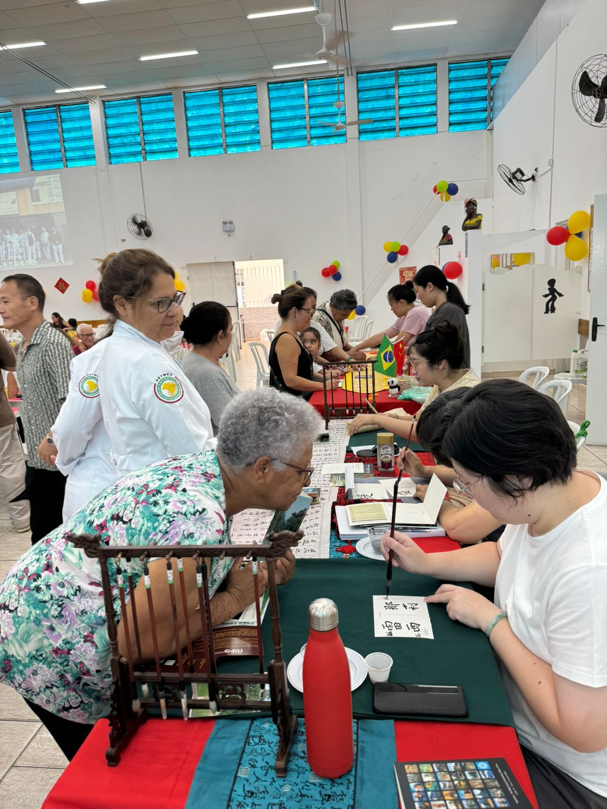 同一时间场下的正前方則由「世界中联」执委、学会馬佩玲副会长陪伴着「孔子学院」的朱晓姝院长所带领的四位老师一早便擺好桌子放上纸墨给在排队的巴西人翻译中文名字,場面熱烘烘的一片。