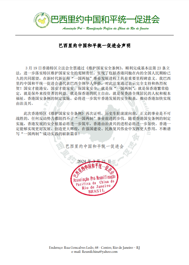 【南美侨报网讯】3月19日香港特区立法会全票通过《维护国家安全条例》,顺利完成基本法第23条立法,进一步落实特区维护国家安全的宪制责任,实现了包括香港同胞在内的全国人民期盼已久的共同愿望,在新时代新征程“一国两制”事业发展进程上具有重要里程碑意义。我巴西里约中国和平统一促进会谨代表巴西全体华人华侨,对此法案通过表示完全支持和热烈祝贺!国安才能港安,国安才能家安。保国家安全,就是保“一国两制”,就是保香港繁荣稳定,就是保外来投资者的利益,就是保香港的民主自由,就是保香港全体居民的人权和根本福祉。香港国安条例的制定实施,必将进一步筑牢香港发展的安全根基,推动香港加快实现由治及兴。