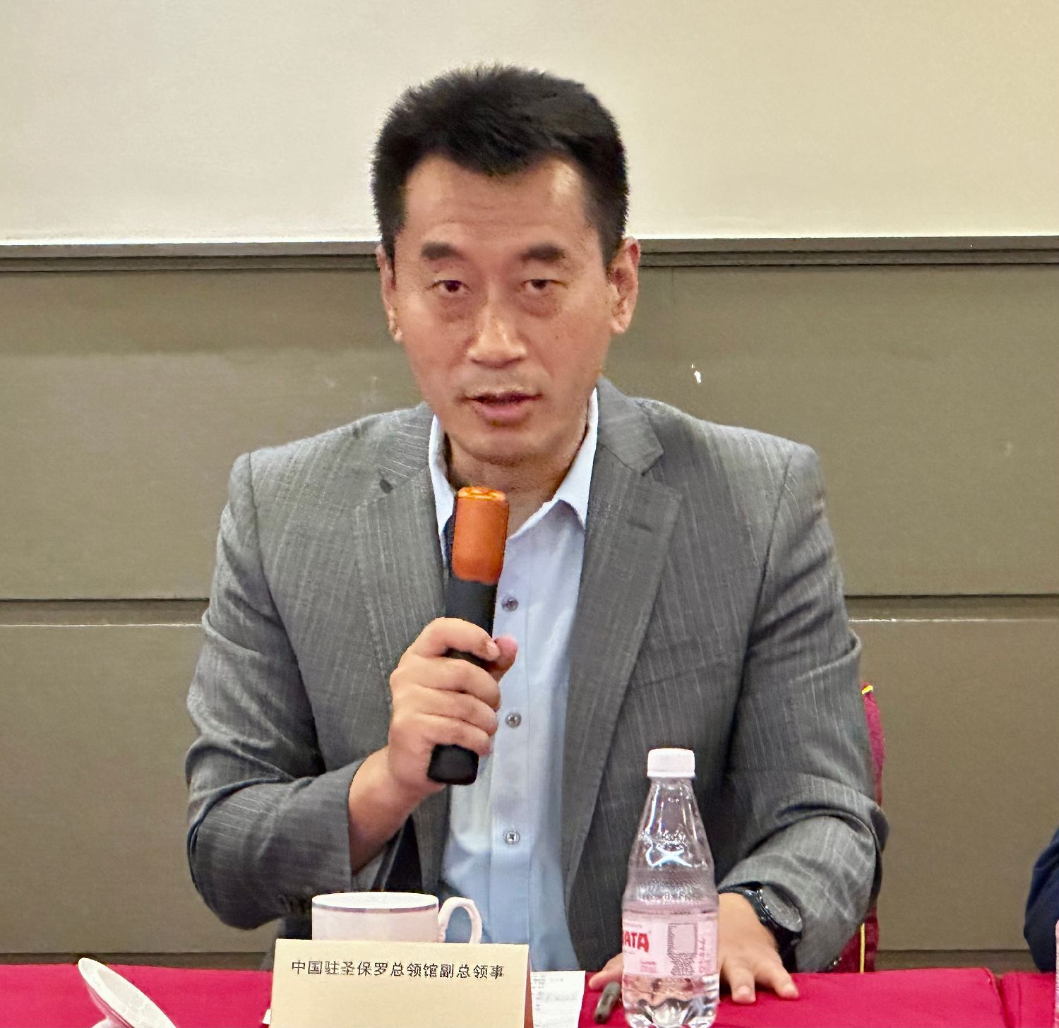 田玉震副总领事在讲话中,代表驻圣白莲总领馆热烈欢迎杨晋柏会长率团访圣保罗,预祝代表团访巴取得圆满成功。他表示,当前,北京市正在以首善标准,不断优化营商环境,推进高质量发展。我们期待并相信,北京市将进一步发挥好自身优势,不断深化和拓展与圣保罗州、圣保罗市业已存在的友好合作关系,为中巴关系的提质升级、行稳致远发挥重要作用。