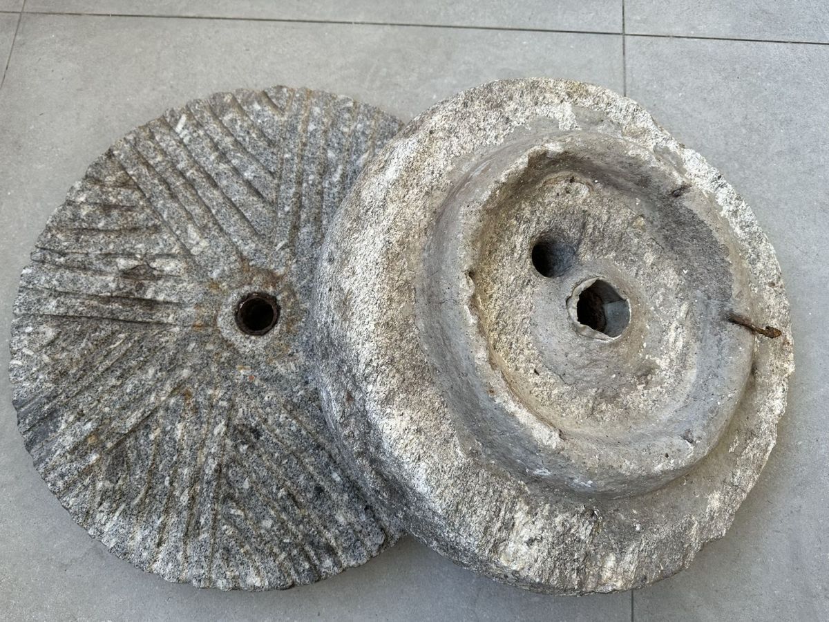 这副圆形石磨直径达70厘米,分为上盘和下盘两部分。上盘有一个圆形粮栏,中间设有两个圆孔,而下盘内部则有一个用于设置磨脐的圆孔。两盘都刻有斜线沟槽作为磨齿,展现了精湛的制作工艺。