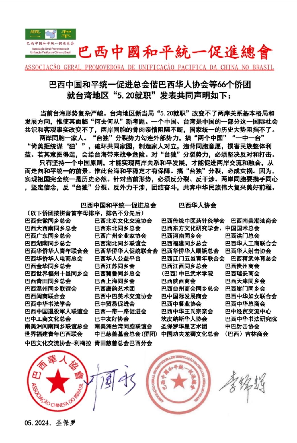 巴西中国和平统一促进总会偕巴西华人协会等66侨团发表声明