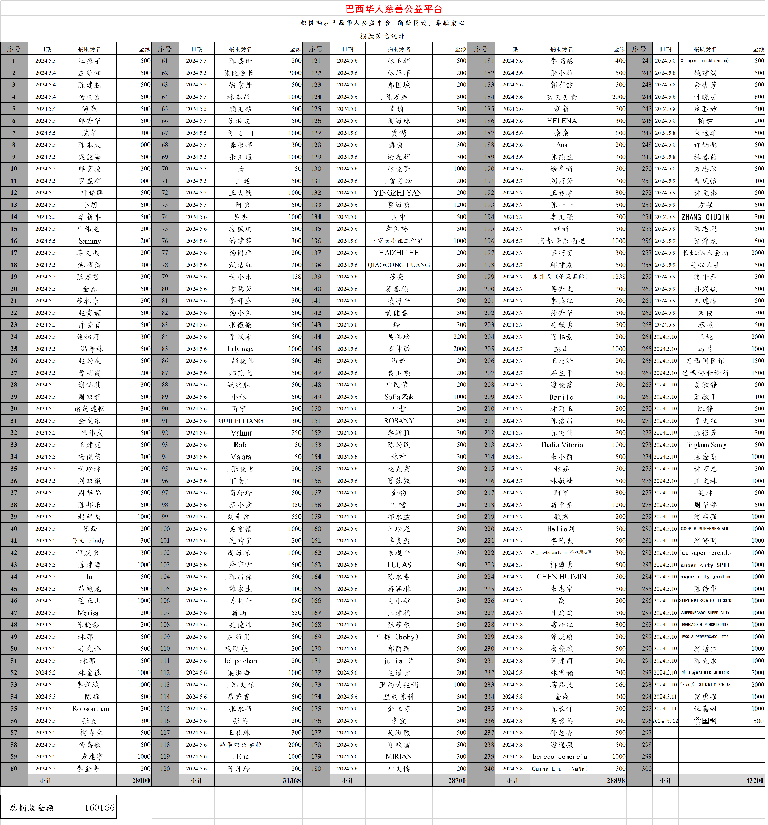 南大河州水灾发生后,巴西华人慈善公益平台发动会员积极捐款,得到200多名会员侨胞积极响应,在短短一周内,筹集到160,166巴币的善款。其中有巴西友人的捐赠,还有来自巴西天天华侨教育学校和巴西幼华双语学校的师生们及几位来自福建福清的几位侨胞筹集的善款。