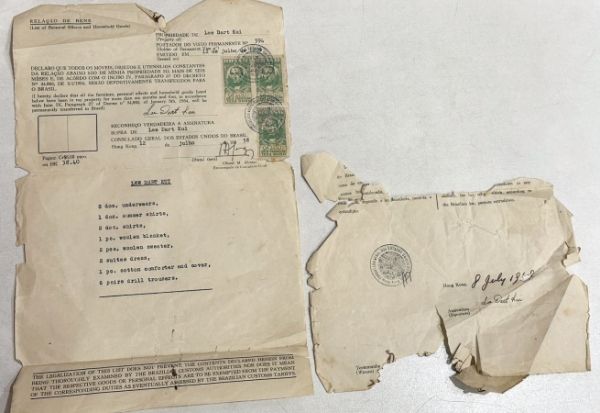 李浓忠带来的文物是他父亲李达枢先生的私人物品,1969年巴西驻香港领馆签发的签证和当时使用的中华民国护照以及疫苗证明(入境巴西用),李浓忠谈到,1969年中国和巴西还没有建交,作为中国人的李达枢,只能拿着中华民国的护照,去香港的巴西领馆去办理签证。另外还有1974年李达枢先生等人与中国驻巴西第一任大使张德群先生的合影照片,李浓忠谈到,当时父亲李达枢先生与几位侨领参与了建设巴西利亚中国大使馆的工程,张德群大使经常与他们谈话,也非常关心他们。1976年,他因为要来巴西与父亲团聚,但因私护照迟迟办不下来,张大使知道后帮助联系了国内相关部门,他才顺利办理了护照,成为中巴建交后最早一批的中国移民。