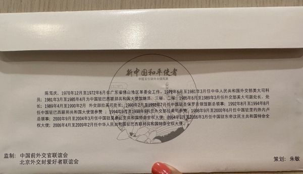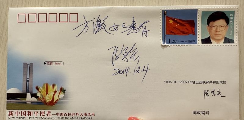 方激女士捐赠了一份用陈笃庆大使照片印制的邮票及首日封。信封上写着:方激女士惠存陈笃庆2014.12.4。方激介绍说,陈笃庆大使在2006到2009期间担任中国驻巴西大使,巴西政府授予他“南十字国家勋章”,他回到北京以后,也一直致力于促进中巴两国关系的发展和加深两国人民友谊。2014年她回国拜访陈先生时,得他赠送这枚珍贵的邮票和亲笔签名,她一直珍藏至今。方激表示,她希望将这份对过去岁月的宝贵回忆与大家分享。