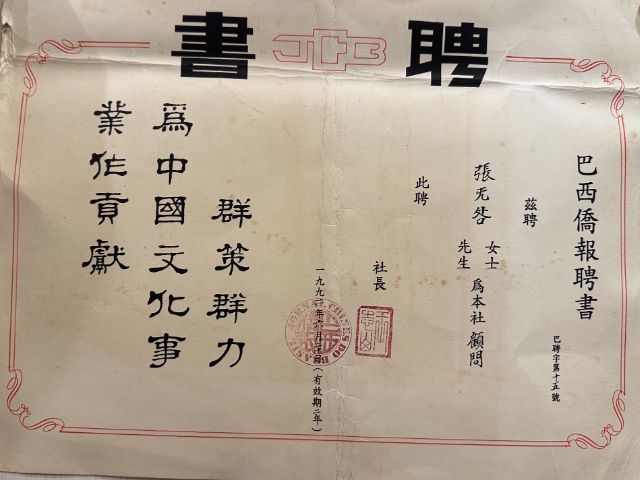 【南美侨报记者庄沂圣保罗报道】5月20日,在巴西华人华侨文物征集委员会举办文物接收仪式。巴西中国和平统一促进总会会长李锦辉、方激、李浓忠为征集活动捐赠多件收藏,包括1991年协会成立大会嘉宾签名簿、巴西侨报顾问聘书、陈笃庆大使纪念邮票、1958年的巴西签证纸等,征集委员会成员叶周永、赵永平、苏新效、高沁翔、林筠、周长莉出席接收仪式。
