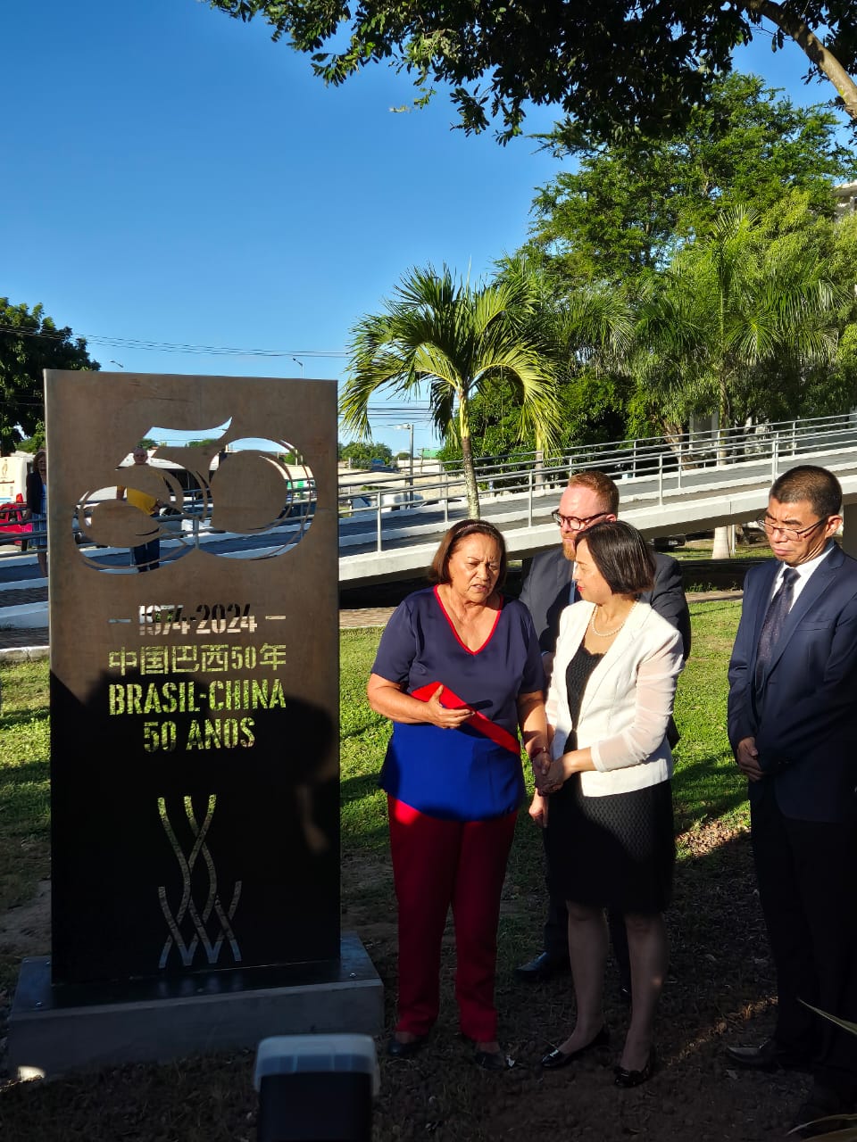 【南美侨报特约记者陈莉莉纳塔尔市报道】2024年是中国和巴西建交50周年,巴西各地纷纷举办活动以示庆祝。6月3日下午,北大河州首府纳塔尔市,在州政府经济发展及科学技术创新厅(SEDEC)大院内,举行了”中巴建交50周年纪念标识“铜像的揭幕仪式。中国驻累西腓总领馆兰和平总领事和北大河州贝泽拉(FATIMA BEZERRA)州长共同为铜像揭幕。贝泽拉州长首先致辞,充分肯定了巴中双边关系的稳步发展,全方位互利合作成果显著。特别是在能源合作方面,北大河州走在了全巴西的前面。与中方进行了很多能源合作项目,希望在风能,再生能源等方面开发进一步的合作。巴方视中国为最关键的合作伙伴,愿同中方在新阶段开启新征程,进一步加深拓宽双边合作。