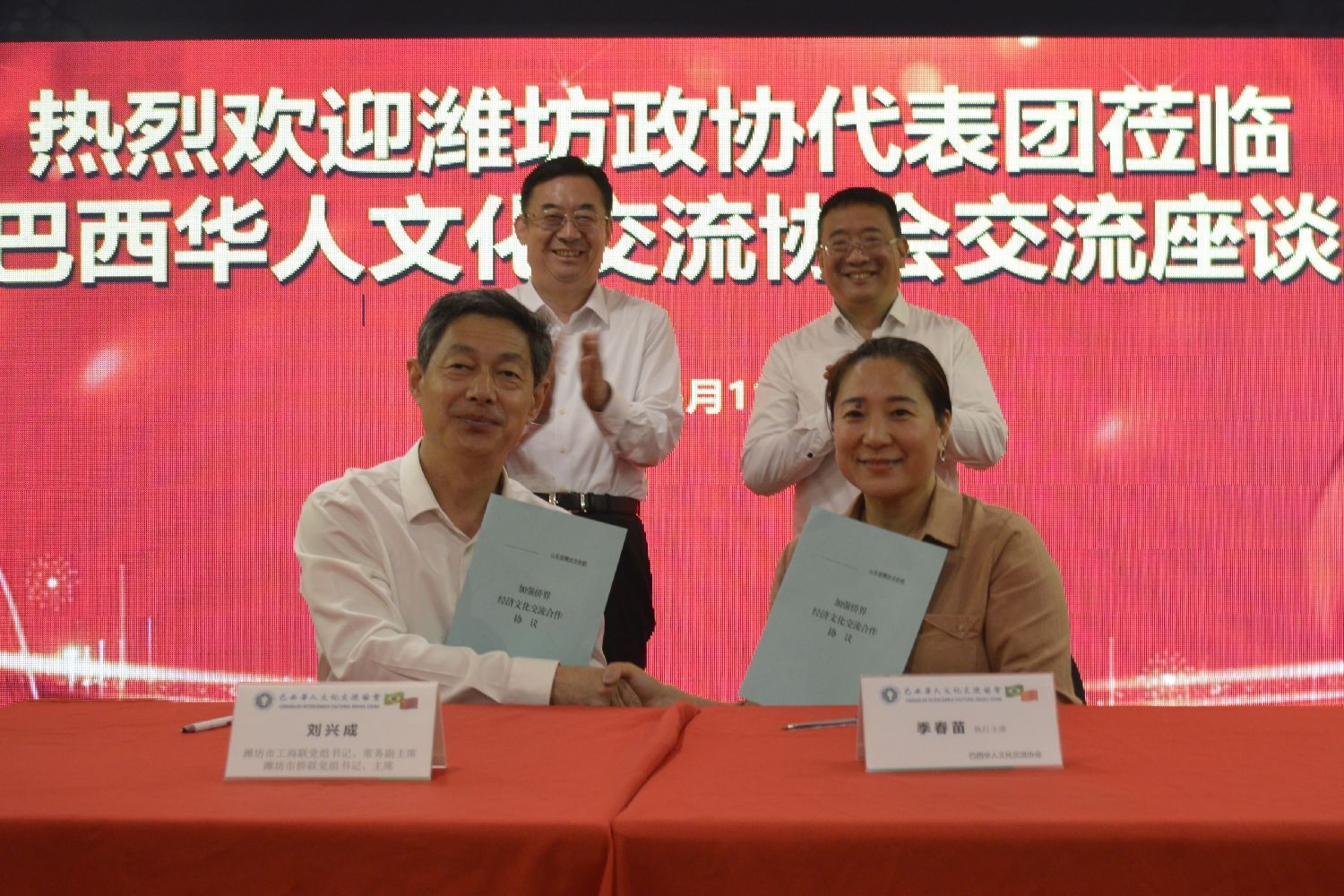 会后,潍坊市侨联主席刘兴成代表侨联与文协执行主席季春苗签订了《加强侨界经济文化交流协议》。山东省潍坊市政协主席李爱杰和巴西华人文化交流协会主席上官建峰见证了签约仪式。