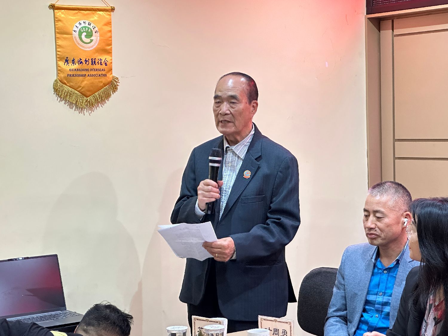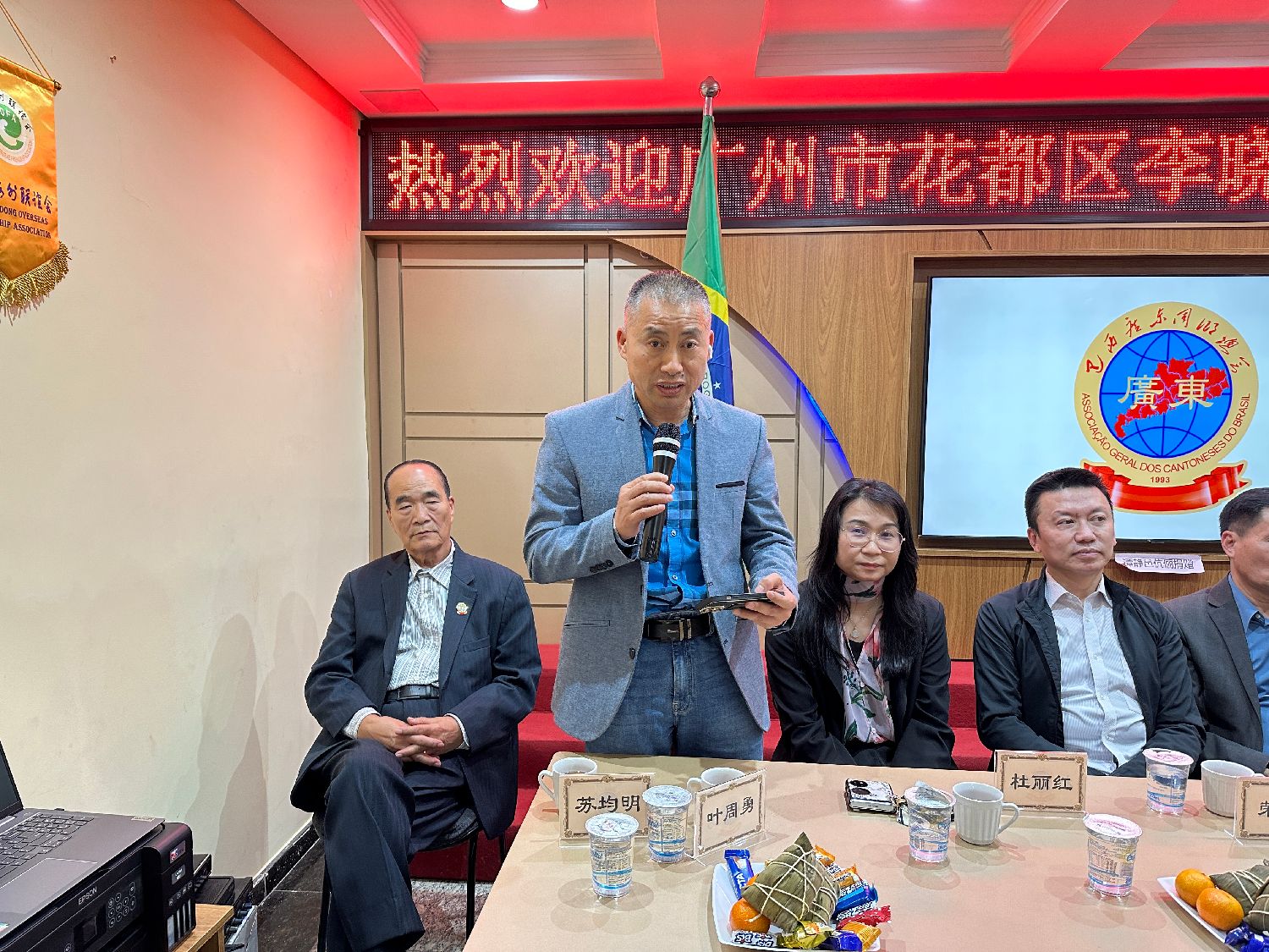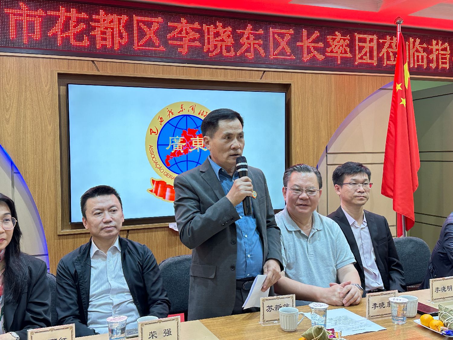 苏均明老会长也发表了热情洋溢的致辞。他引用端午节的诗句“五月艾叶香千里,端午粽情系九州”,欢迎花都区政府代表团的到访,并表达了对祖国亲人的深情厚谊。苏均明表示,花都区的代表团此次到访,不仅是对侨胞的慰问,也为两地的合作交流带来了新的契机。