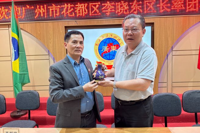 代表团和广东同乡总会进行了礼物交换。李晓光区长向巴西广东同乡总会赠送了花都区特产珐琅花瓶,苏新效会长代表广东同乡总会回赠了纪念品巴西手工皮画。