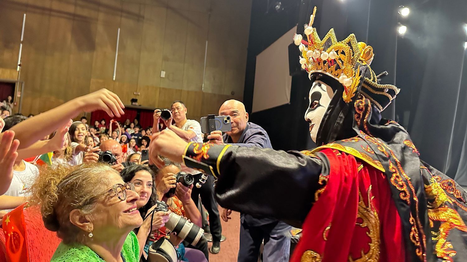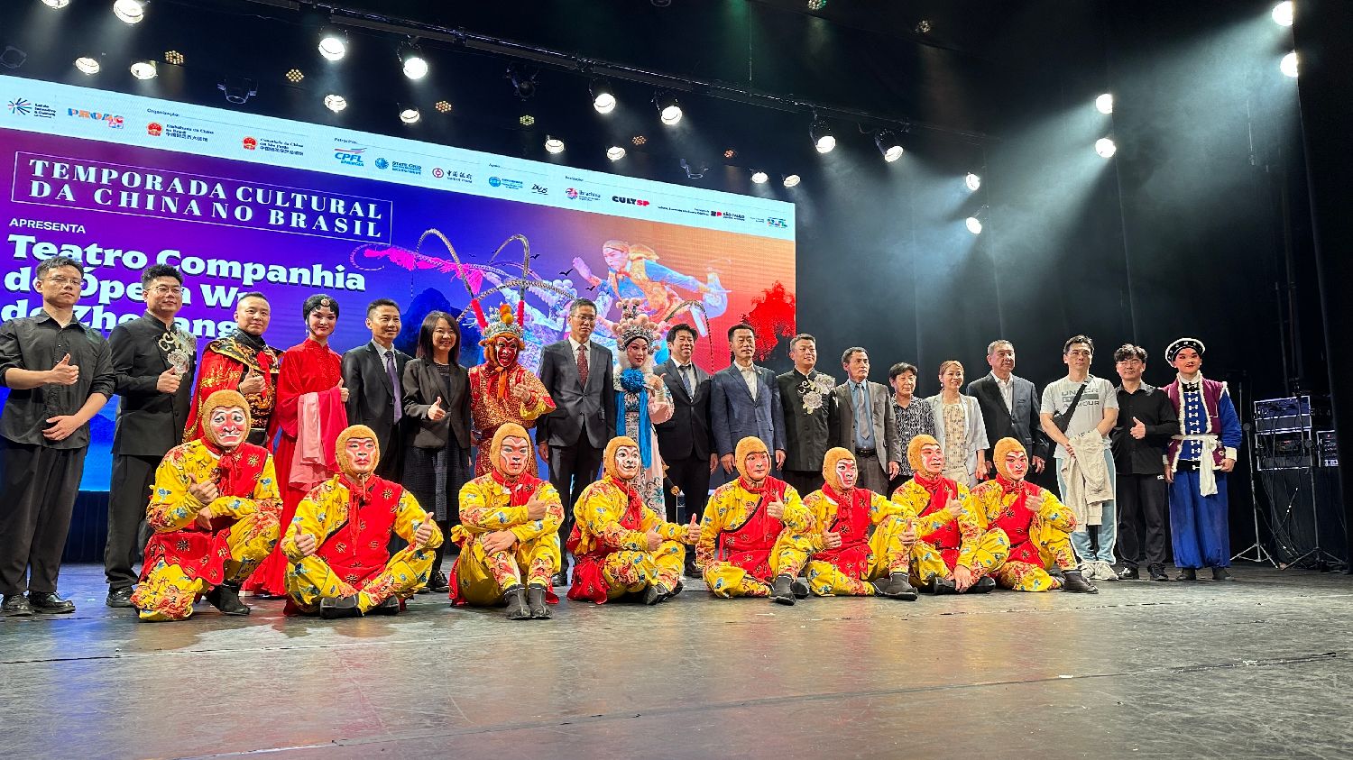 【南美侨报记者庄沂圣保罗报道】为了庆祝中国和巴西建交50周年,8月19日,浙江婺剧团在圣保罗新加泽塔剧院(NOVO TEATRO GAZETA)献上了两场精彩纷呈的演出。中国驻圣保罗总领馆总领事余鹏、副总领事田玉震、副总领事汤庆治、商务参赞白春晖及多位领事,浙江婺剧艺术研究院副院长黄庆华,巴西华人协会会长叶周永,巴中社会文化研究中心主席罗士豪,以及圣保罗华人华侨、中文学校师生和巴西民众,共计一千两百余人齐聚一堂,欣赏了这场文化盛宴。