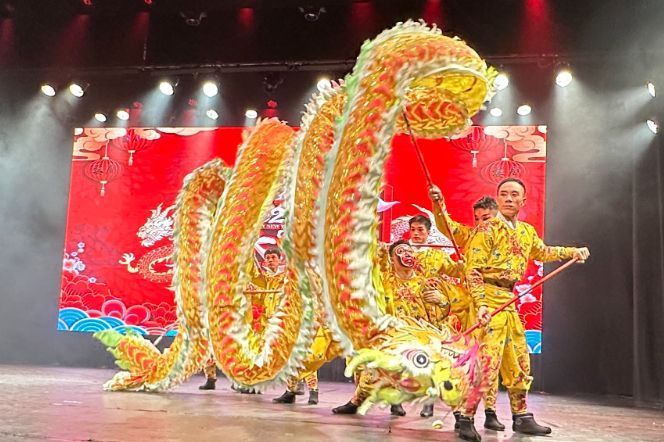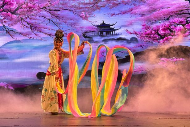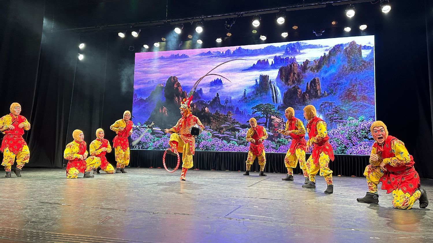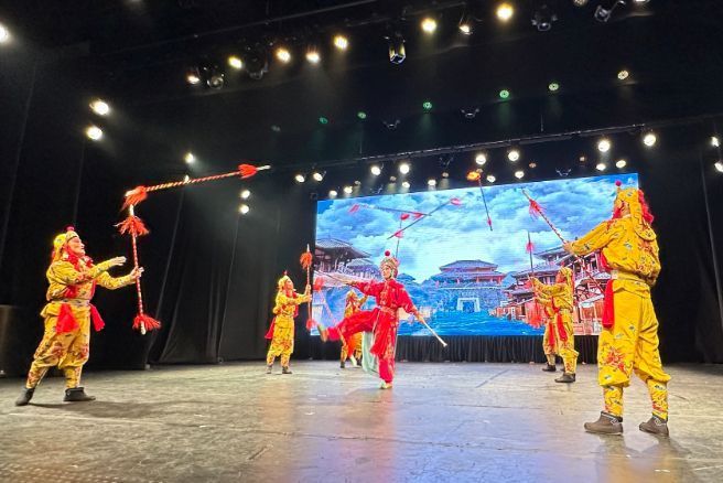 演出以充满活力的《九节龙》开场,紧接着呈现了婺剧音乐《打枣》《徽调》,以及展现婺剧文武兼备特色的折子戏《天女散花》《泗州城》《抬花轿》《挡马》《金猴闹春》等。演员们高亢美妙的唱腔和精湛的表演技艺,让全场观众不禁拍手叫好,掌声与喝彩声此起彼伏。《三岔口》中的小生与武丑在黑暗中紧张对决的滑稽情节,更是逗乐了在场观众,而变脸演员的与观众互动更将演出气氛推向高潮。