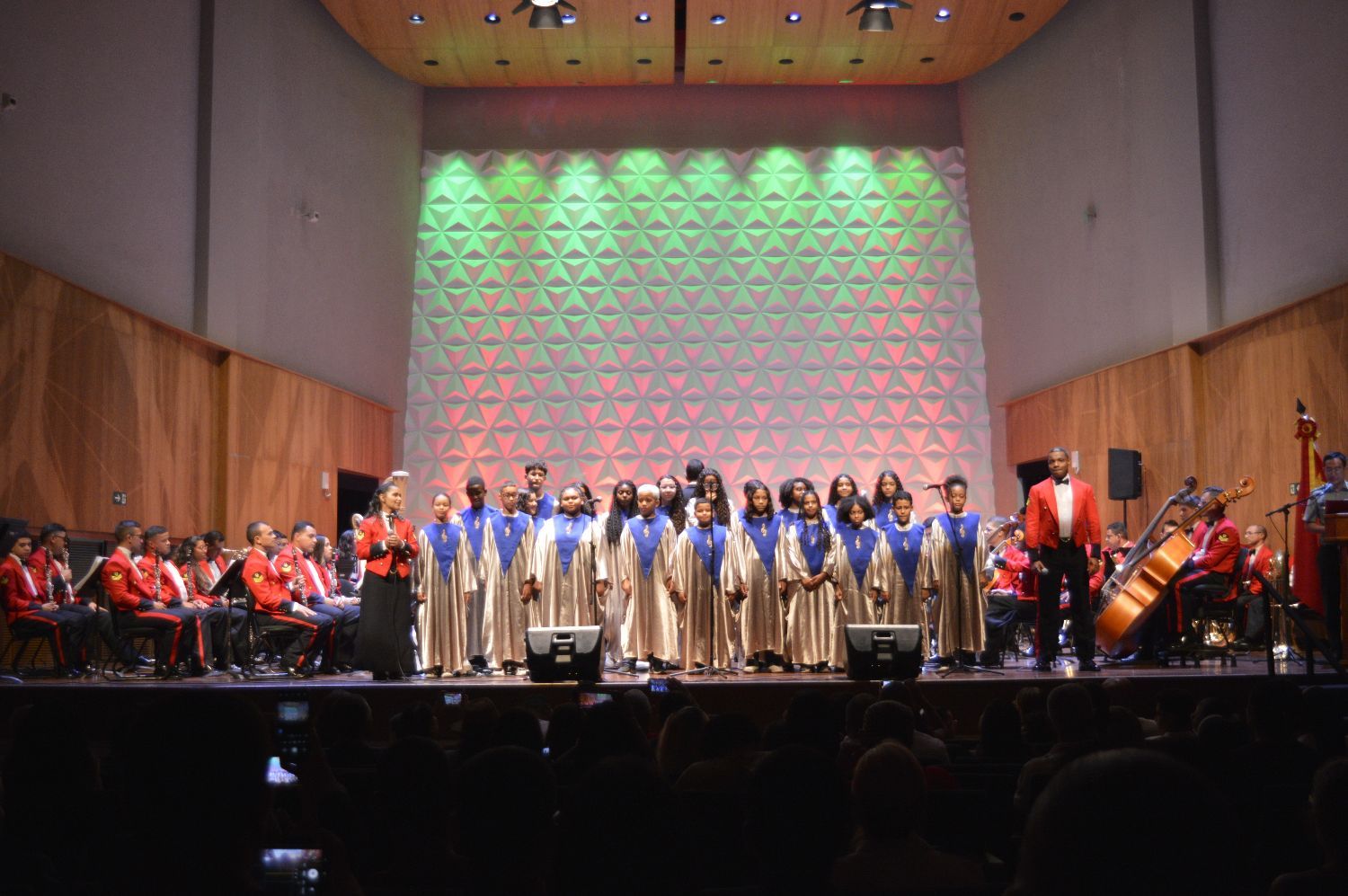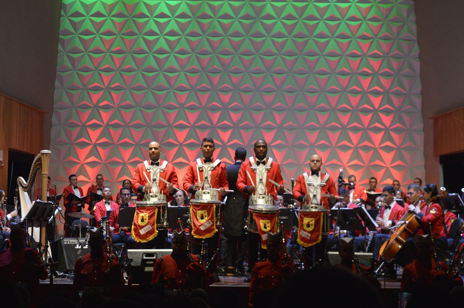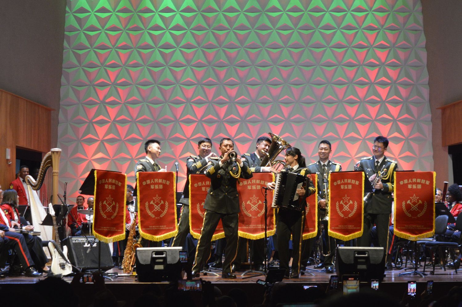 晚间,在巴西里约热内卢的塞西莉亚·梅雷莱斯音乐厅,中国解放军军乐团与巴西海军陆战队军乐团共同演奏,现场气氛热烈。双方共同演奏了《歌唱祖国》和《瓜拉尼序曲》传达了对两国军队祖国的热爱与忠诚,激发了全场观众的共鸣,紧接着是《阿里山的姑娘》、《巴西水彩画》、《茉莉花》等传唱度极高的中巴两国的经典音乐作品,让观众感受到了中巴文化的交融。
