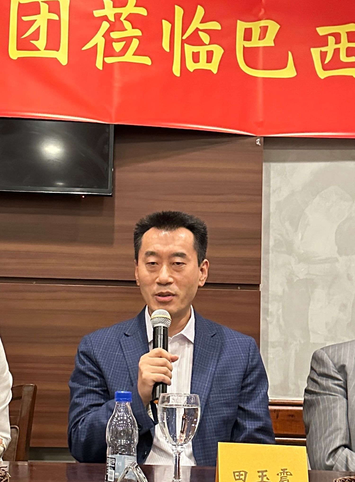 田玉震副总领事在致辞中代表中国驻圣保罗总领馆,向翁云萍主任及代表团成员致表示热烈的欢迎,并预祝代表团的访问圆满成功。他表示,代表团此访正值中巴关系发展的重要时刻。此次访问带来了祖籍国和家乡政府对广大旅巴侨胞的关心关爱与问候,必将有助于进一步凝聚各方力量和共识。田玉震副总领事表示,长期以来,海外侨胞在维护祖国统一、推动中巴关系健康稳定发展方面发挥了重要作用。圣保罗作为巴西华侨华人最为集中的地区,活跃着大量福建籍侨胞。他们积极融入当地,为本地经济社会发展作出了积极贡献,同时也在助力家乡发展建设、推动中巴关系健康稳定发展方面发挥着重要而积极的作用。田玉震副总领事期待与在座侨胞共同努力,为推动新形势下两岸关系和平发展、实现中华民族伟大复兴而共同奋斗。