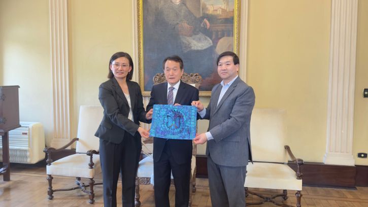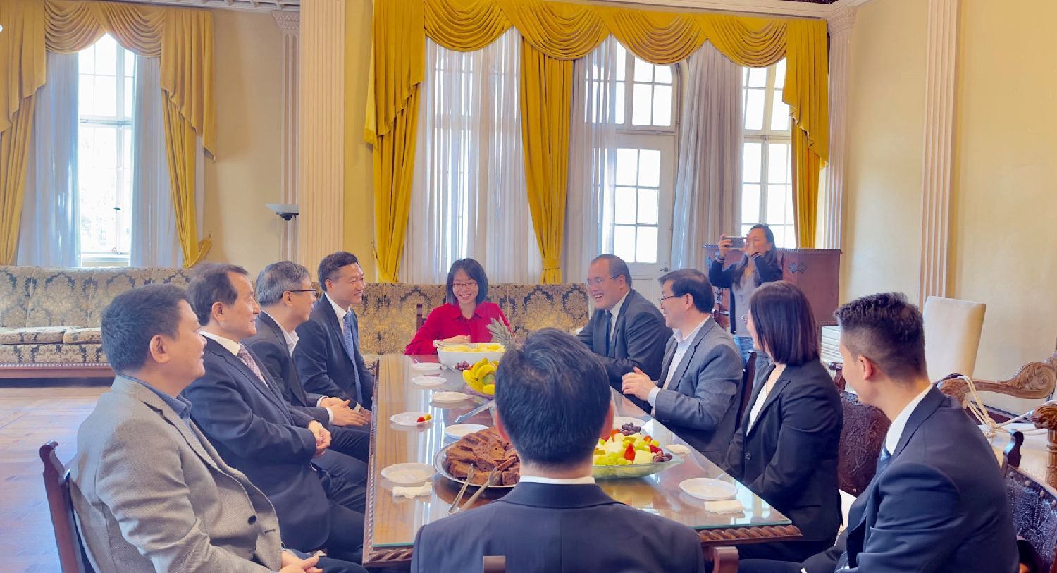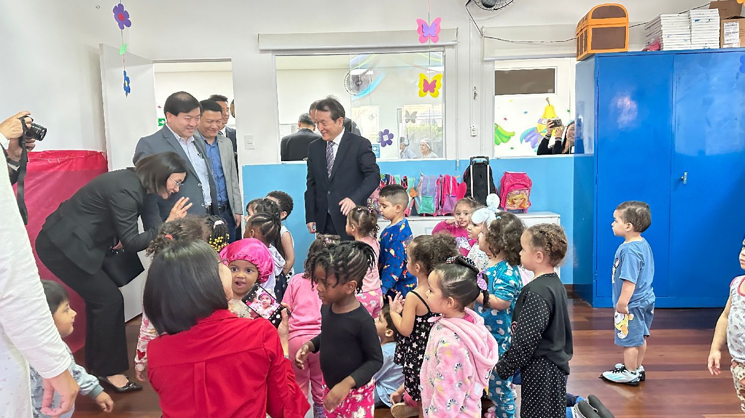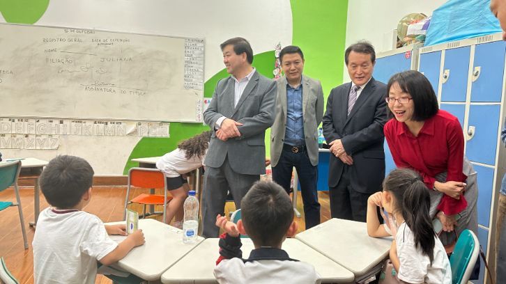 上午10点,代表团首先参观了慈佑慈善幼儿园的园区,了解幼儿园的办学模式和发展情况,并与师生亲切互动。罗淑君介绍,自2019年创办以来,慈佑幼儿园已扩展至六所分园,免费为1100余名幼童提供优质教育。她还特别提到,慈佑幼儿园与天津杨柳青木版年画博物馆、圣保罗华侨天主堂中文学校和圣本笃学校联合开展了“云端”文化交流项目,通过“互联网+教育”的创新方式,120多名中巴两国师生共同学习与展示了中国传统年画《莲年有余》的绘制技艺。她表示,这一项目为巴西的华裔学生提供了感受中华文化的新途径。