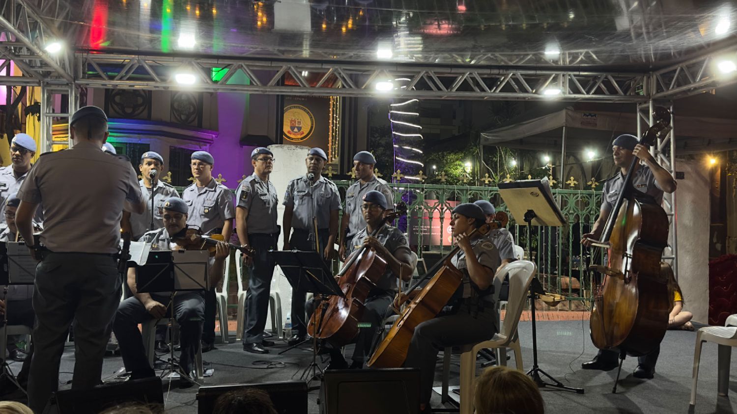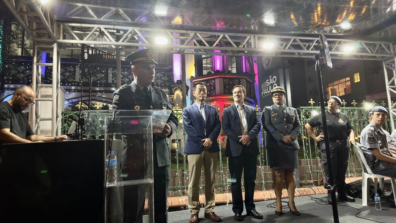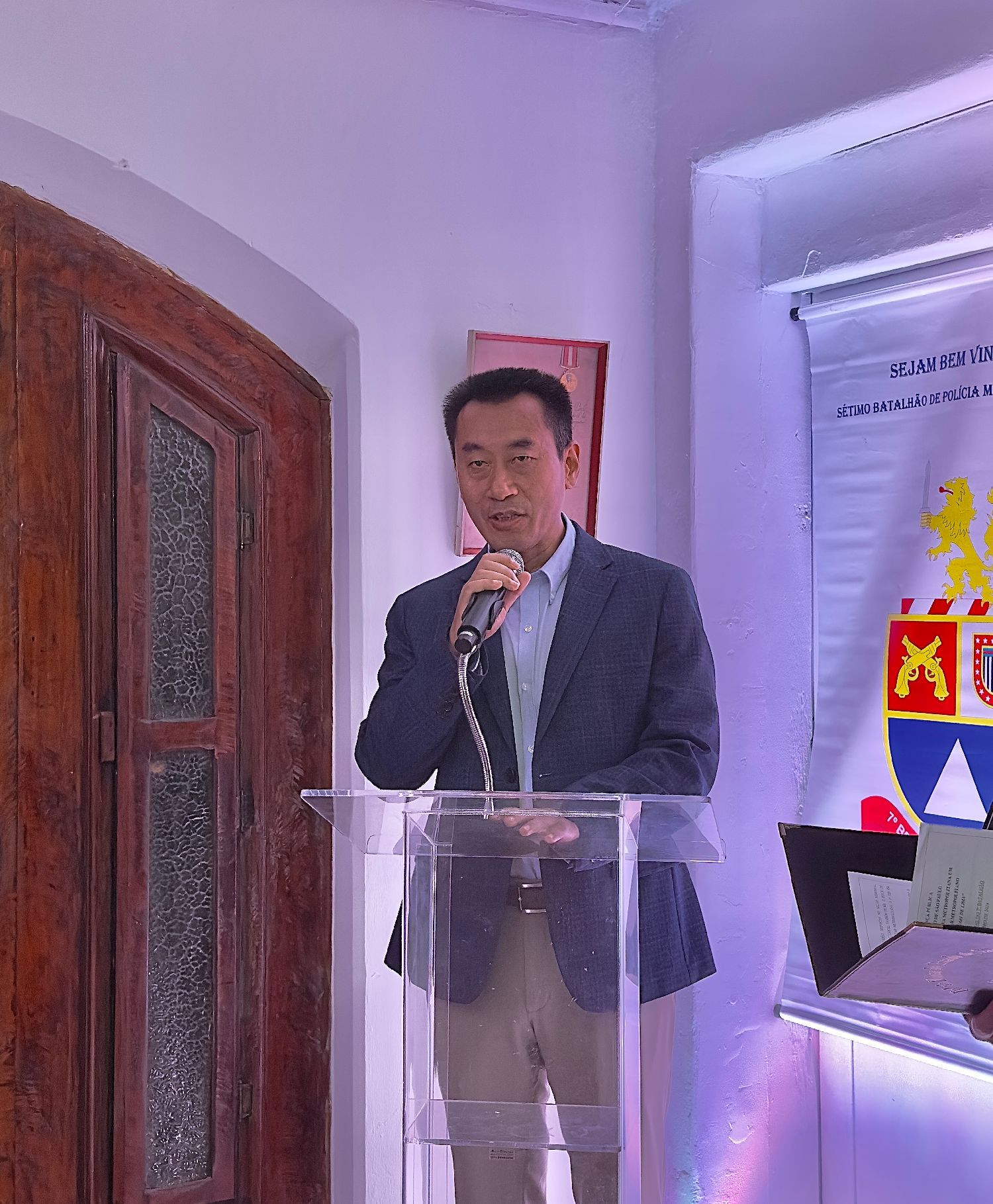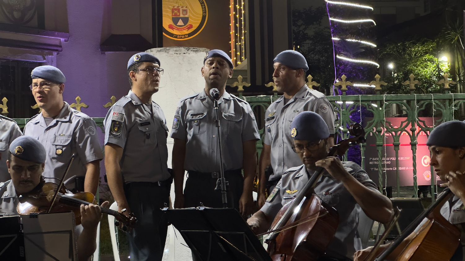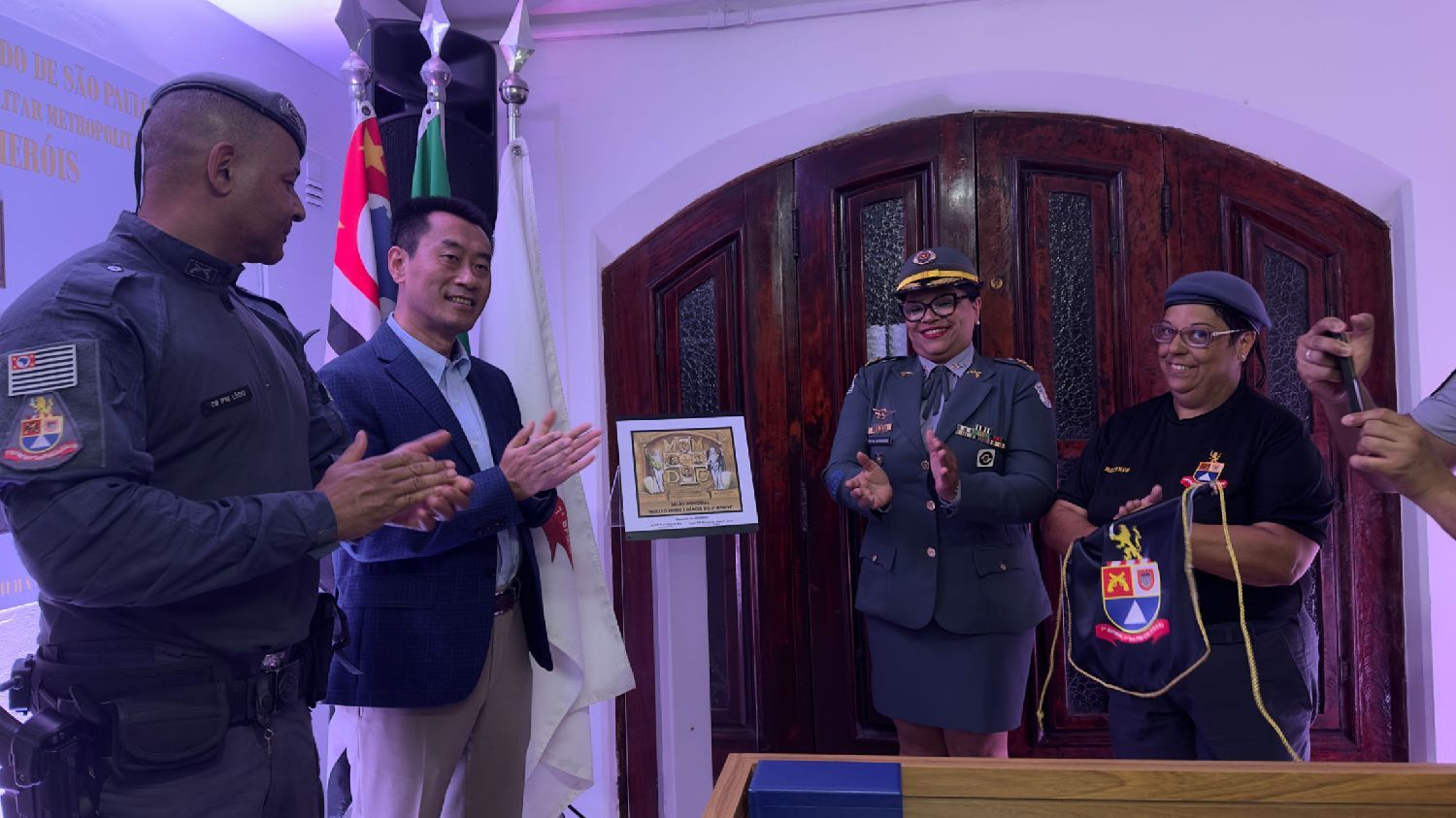 【南美侨报记者庄沂圣保罗报道】12月18日,圣保罗州军警第七营(以“第一中尉卡莱加里”命名)举办圣诞晚会暨“MMDC第七营英雄纪念厅”开幕仪式。中国驻圣保罗总领馆田玉震代总领事、李佳音警官、圣保罗都市区第一警务司令部梅洛上校、市中心区区长阿尔瓦罗·卡米洛、第七营营长罗西梅尔中校、巴西金华同乡会会长章晓红、巴中慈善基金总会会长诸诗琦、巴中射击协会会长林旭、巴西华人华侨羽毛球协会会长许明林、18位侨社代表、军警人员以及社区居民等各界人士参加开幕仪式并共度欢乐时光。