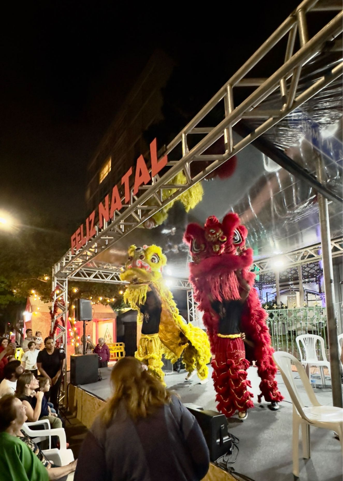 当天,安杰利卡大道设置了表演舞台,军警第七营驻地布置了各种圣诞装饰、圣诞花环、圣诞树,还特别挂上了中国的红灯笼。晚会上,第七军警营的军警乐团奏响经典乐章和圣诞歌曲,让活动充满节日氛围,侨社代表准备的中国舞狮表演更增添了喜庆和欢乐。压轴登场的圣诞老人,在闪烁的警灯与警笛声中乘车而至,为孩子们送上礼物与祝福,将晚会的气氛推至高潮。