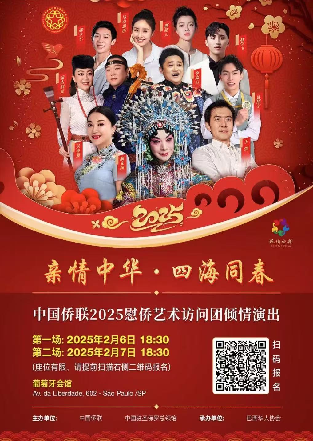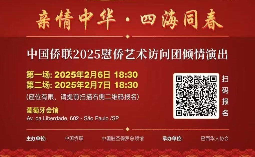 新春佳节将至,远隔重洋的思念化作温暖的相聚!由中国侨联、中国驻圣保罗总总领馆主办,巴西华人协会承办的“亲情中华·四海同春”慰侨访演团,将于2025年2月6日(周四)、7日(周五)晚在圣保罗隆重献上两场精彩演出,为海外游子送上祖国的深情问候,共庆新春团圆!