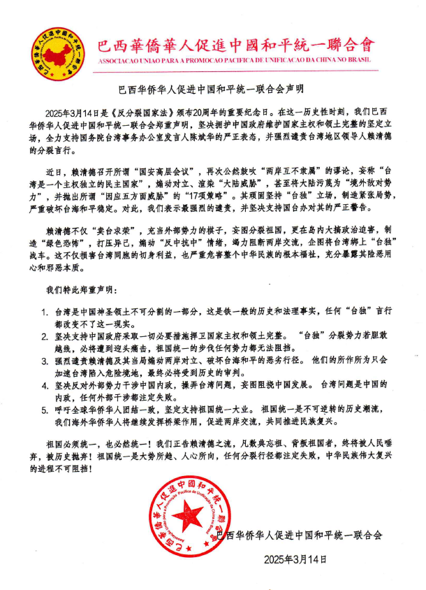 巴西华侨华人促进中国和平统一联合会声明