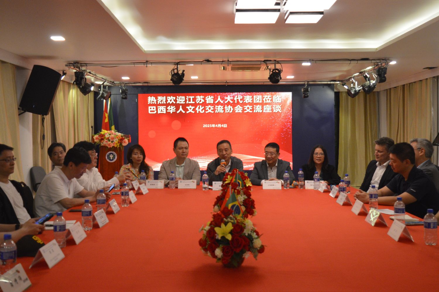 【南美侨报特约记者陈妤汎里约热内卢报道】4月4日,巴西华人文化交流协会(以下简称“文协”)与江苏省人大代表团于里约热内卢举行座谈会。巴西华人文化交流协会主席上官建峰在文协会馆热烈迎接了由江苏省人民代表大会常务委员会常务副主任樊金龙率领的江苏省人大代表团一行。中国驻里约热内卢总领馆副总领事王尉育、巴西中国友好协会主席恩里克·诺布雷加、巴西中国问题专家高文勇出席座谈并致辞。此外,中国驻里约热内卢总领馆领侨处处长齐冀、全国人大代表、徐工集团工程机械股份有限公司总工程师单增海、巴西华人文化交流协会常务副主席黄艳娟、秘书长伍小曼等侨领、侨胞代表也参与了此次座谈。