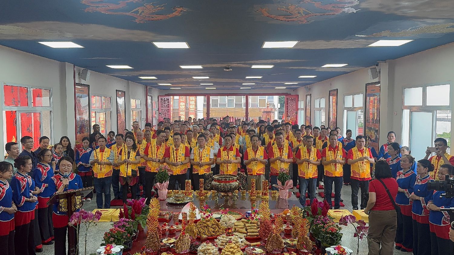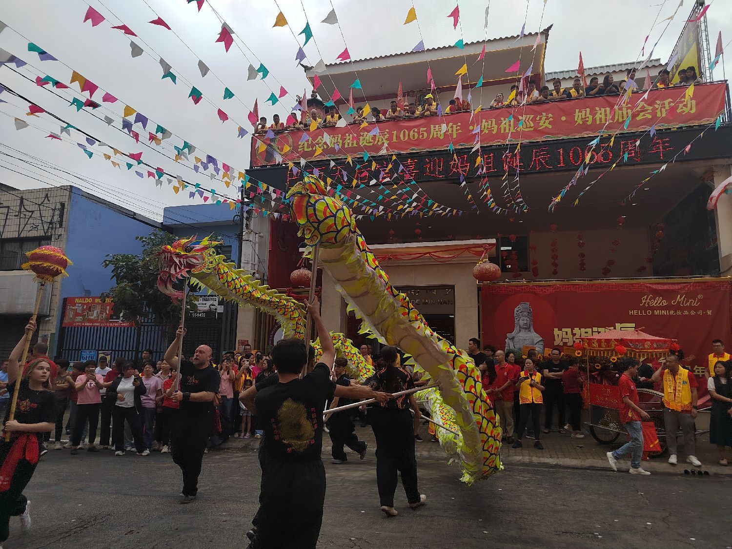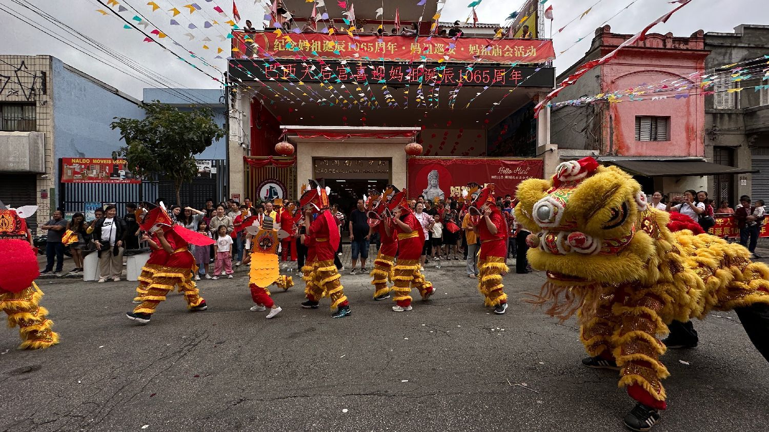 上午11时,随着锣鼓喧天、旌旗飞扬,位于Bom Retiro的巴西天后宫正式拉开庆典帷幕。传统舞龙舞狮表演精彩纷呈,车鼓队的表演,将现场氛围推向高潮。在吉祥钟鼓声中,巴西妈祖庙依循古礼举行庄重的“三献礼”仪式。祭坛上布满五谷、鲜果、锦帛,上百名信众在《咸平之章》雅乐声中行三跪九叩大礼,场面庄严感人。