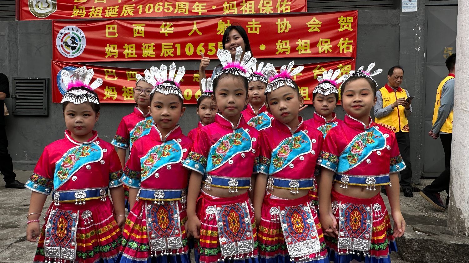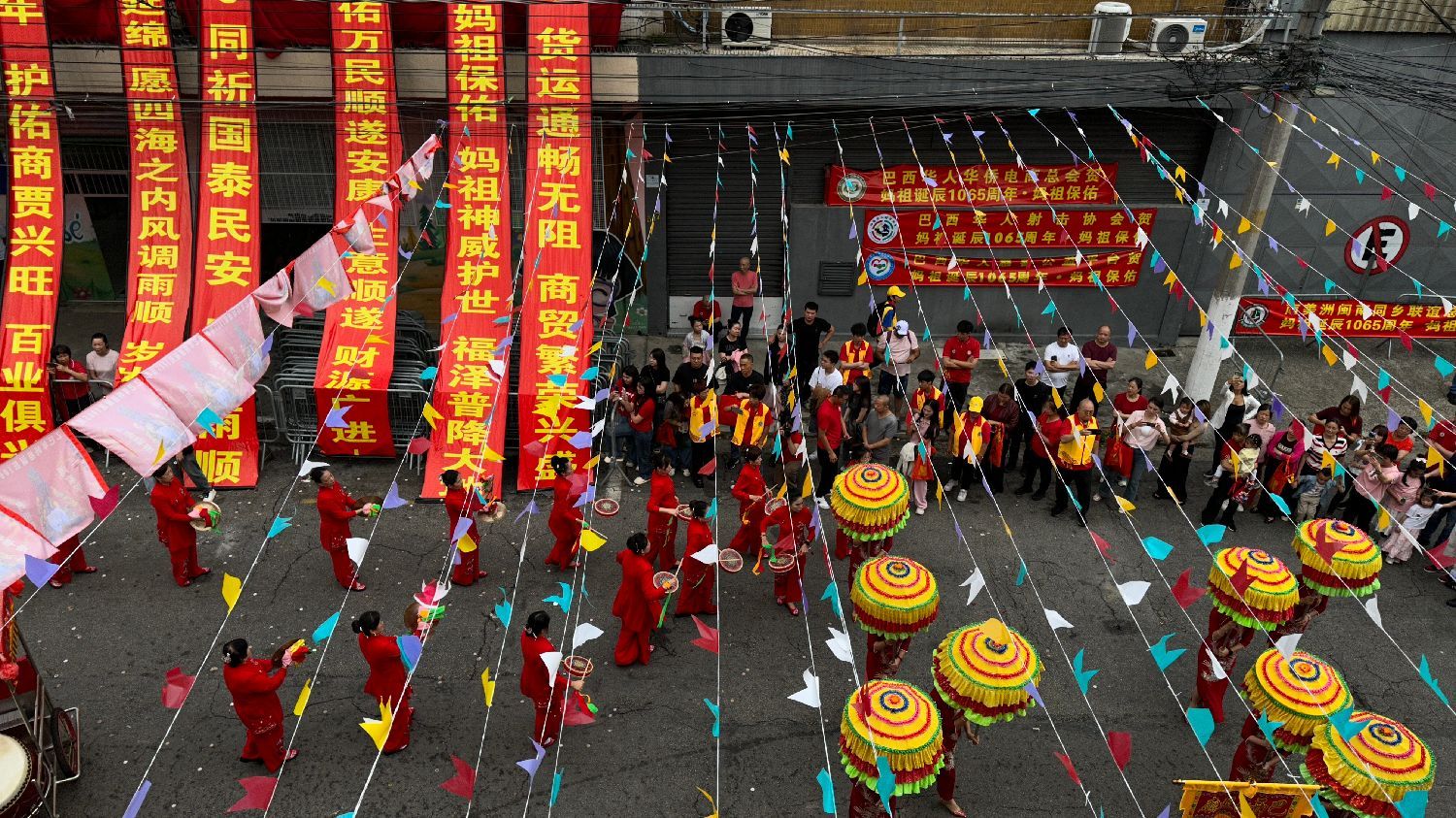 活动现场装饰一新,广场上悬挂着富有巴西本地风情的彩旗,10条12米长的祈福绸带随风飘扬,传递出人们对幸福生活的美好祝愿和对妈祖慈悲精神的敬仰之情。