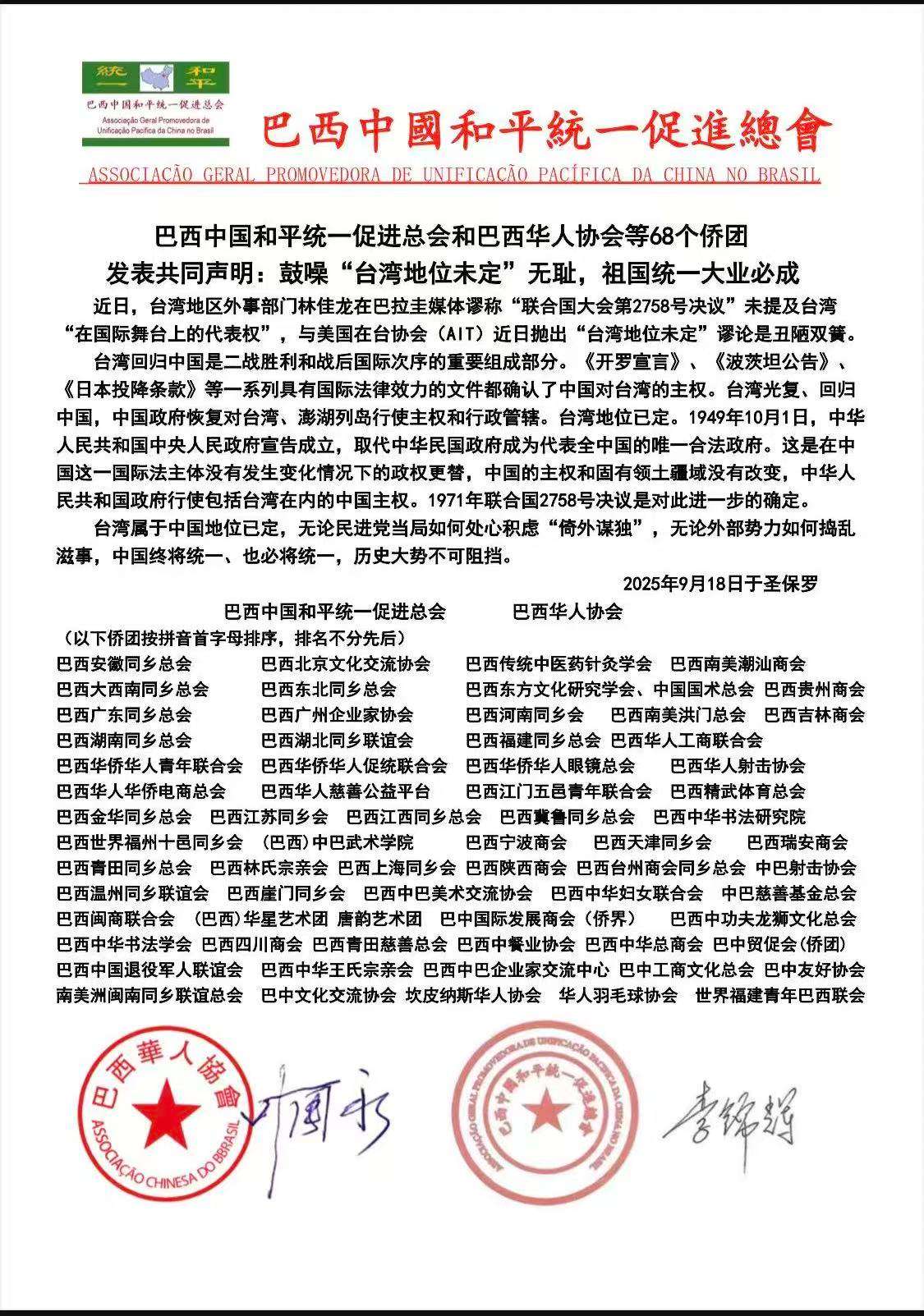 巴西中国和平统一促进总会和巴西华人协会等68个侨团共同声明:鼓噪“台湾地位未定”无耻,祖国统一大业必成