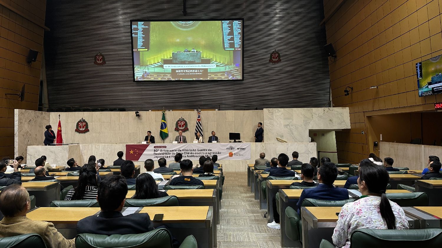 【南美侨报特约记者庄沂圣保罗报道】9月19日晚,圣保罗州议会庄严举行中国人民抗日战争暨世界反法西斯战争胜利80周年纪念大会。本次活动由圣保罗州议会巴中友好小组与中国驻圣保罗总领事馆联合主办,州议会首席秘书长毛里西议员主持。中国驻圣保罗代总领事张希、副总领事谢炎村、领侨处主任荣强、双边处副主任庄苏,巴西华人协会监事长王万瑞,以及中资企业及侨社代表、圣保罗联邦大学奥萨斯库校区和联邦ABC大学的国际关系专业学生等100余人出席。