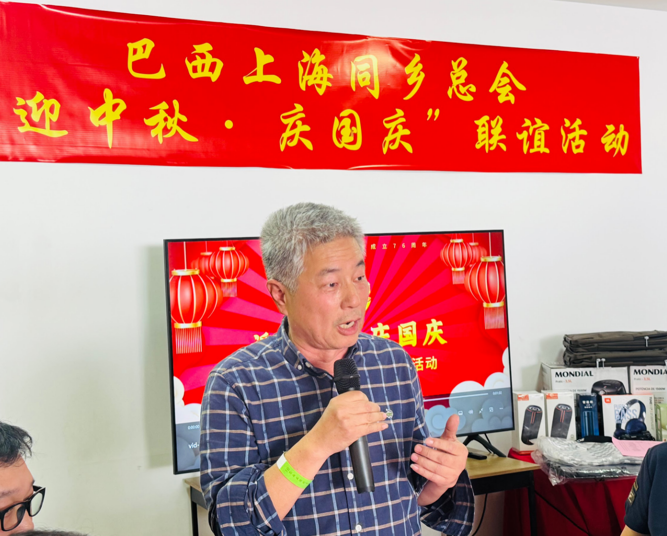 潘树程会长特别用家乡话——上海话发表致辞。他强调,虽然在巴西的上海人数量并不算多,但正因如此,更需要团结一致、互相扶持。此次联谊活动不仅是一次节日的欢聚,更是重组人心、凝聚力量的新起点。他还提出了未来发展的方向:计划创办《上海快报》,记录华人在巴西的点点滴滴;并筹备举办“双城论坛”,以圣保罗和上海为纽带,推动两地文化与经贸的交流合作。
