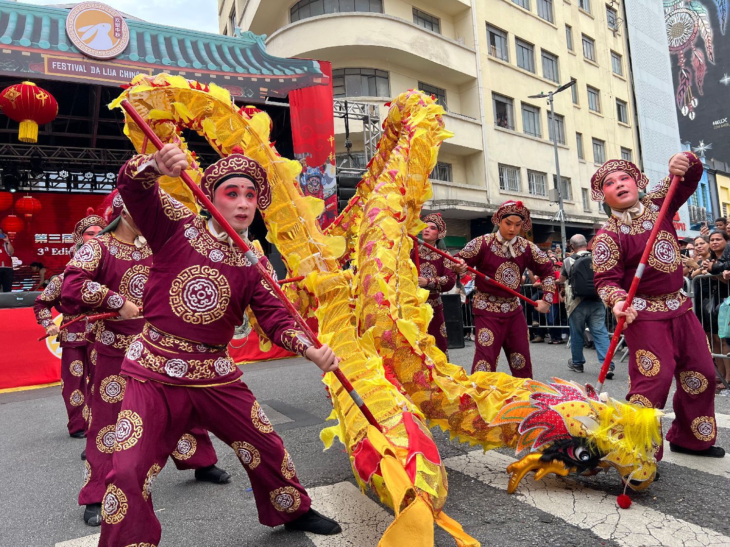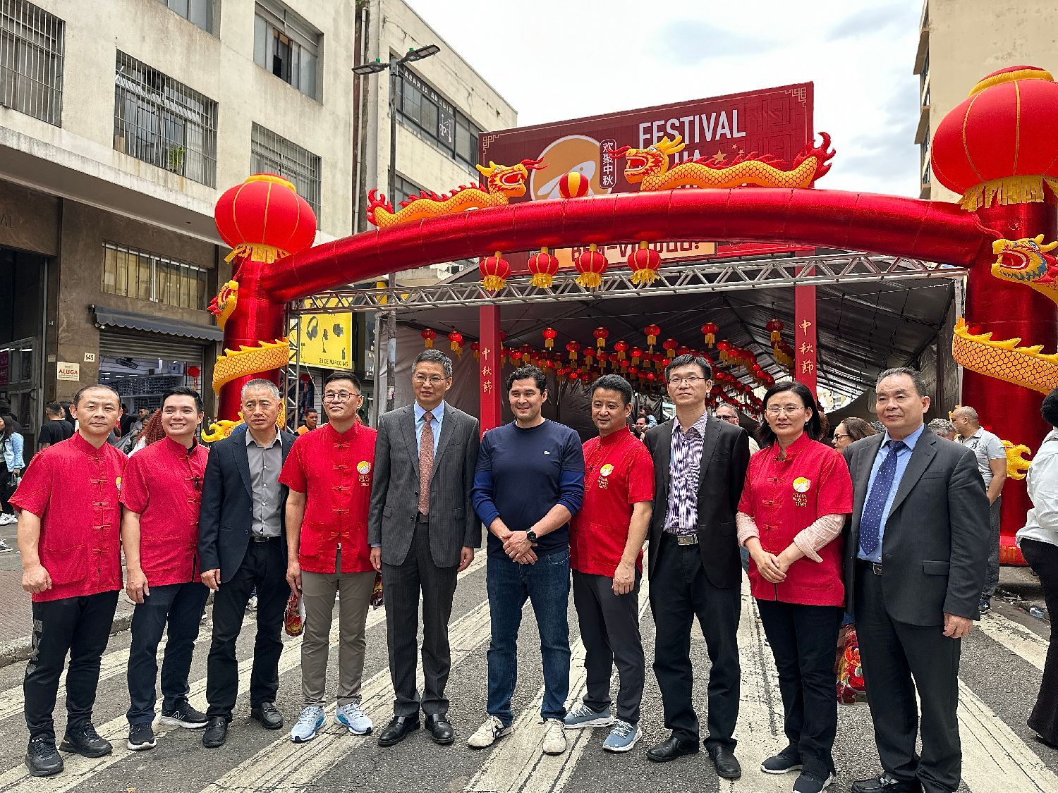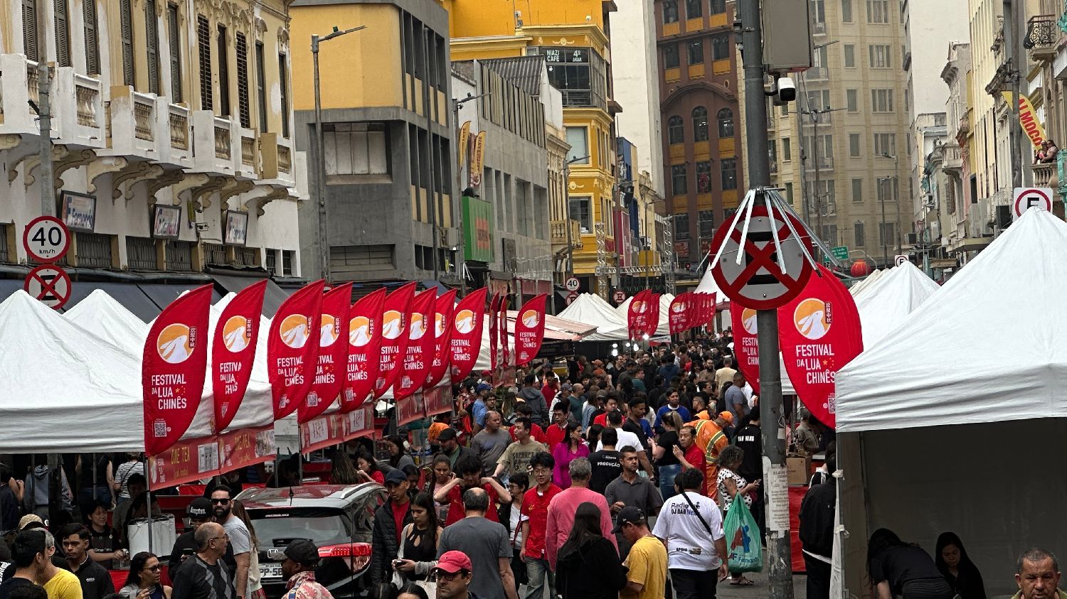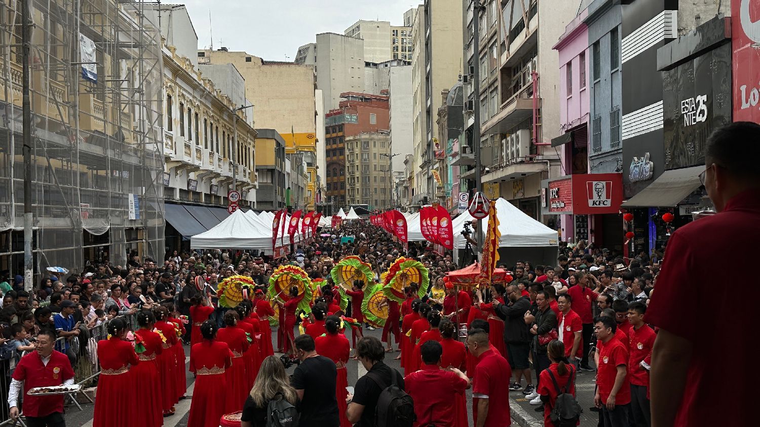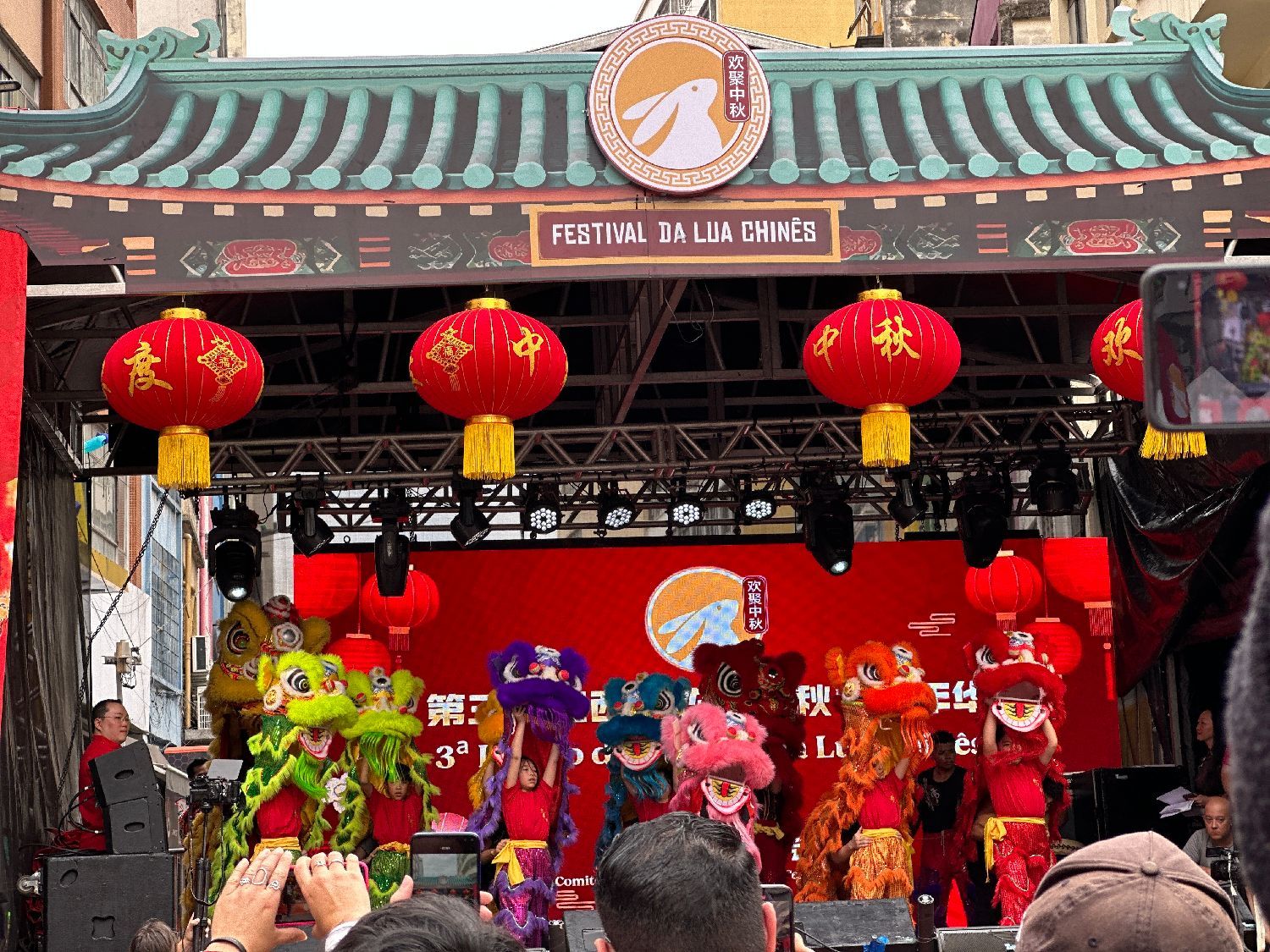 节日的25街洋溢着浓浓的喜庆气氛。以两个红色彩虹门为界,近千米的长街上美食摊位、文化展区和表演舞台依次铺陈。装饰着飞檐的舞台上,大红灯笼高高悬挂,“欢聚中秋”(Festival da Lua Chinesa)的标识格外醒目,处处洋溢着浓郁的东方韵味,吸引无数民众驻足拍照。