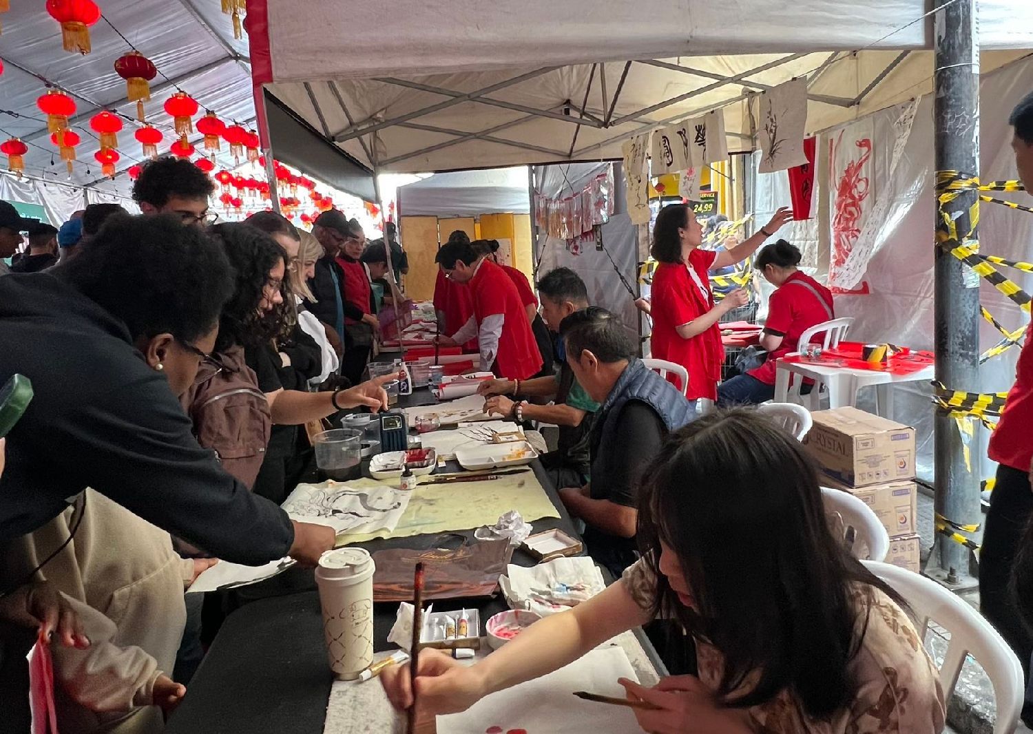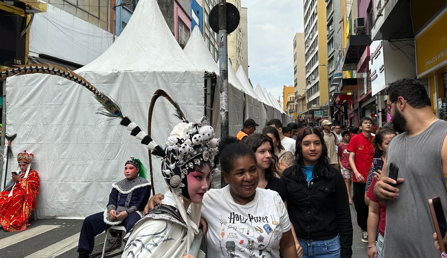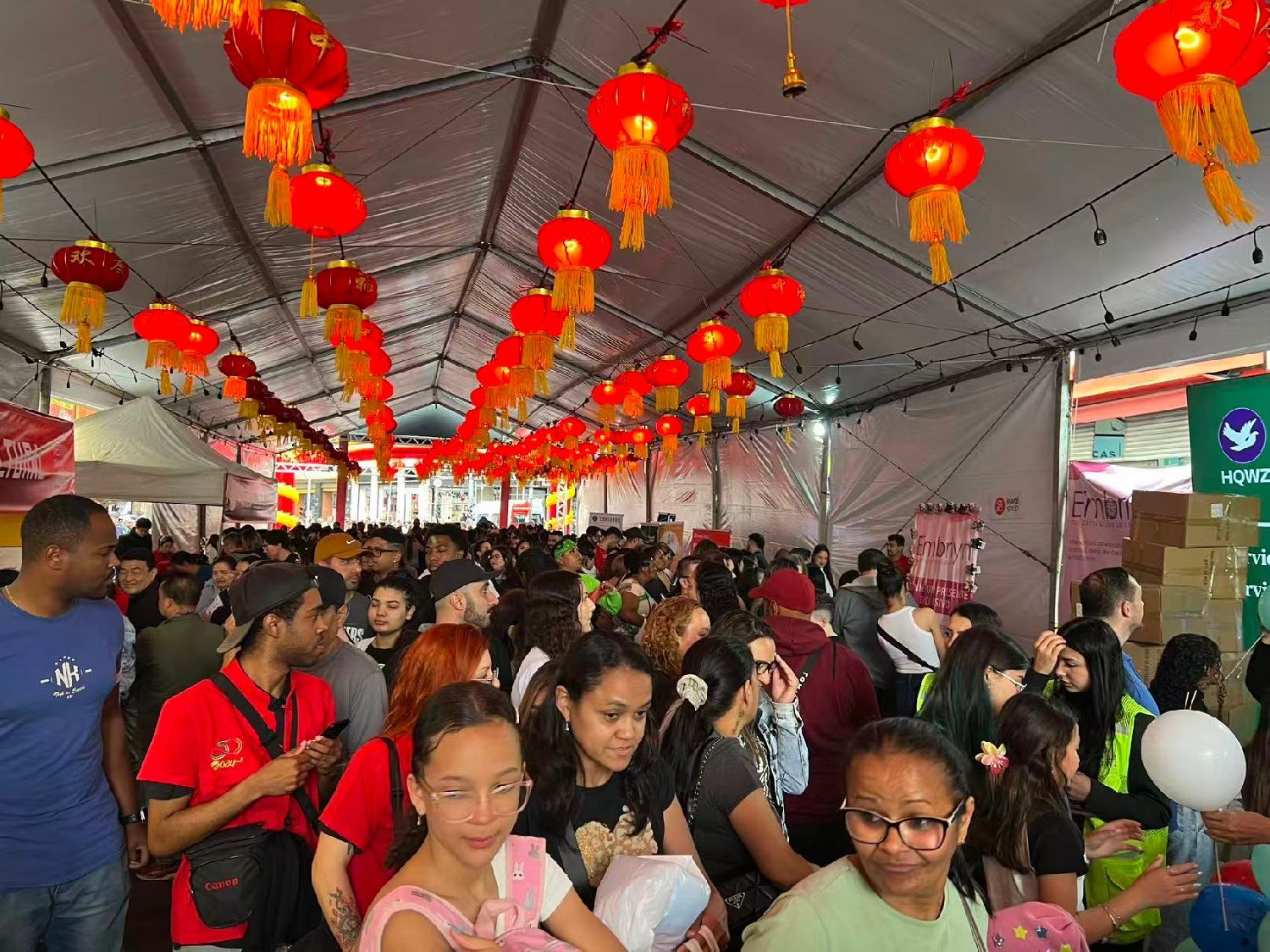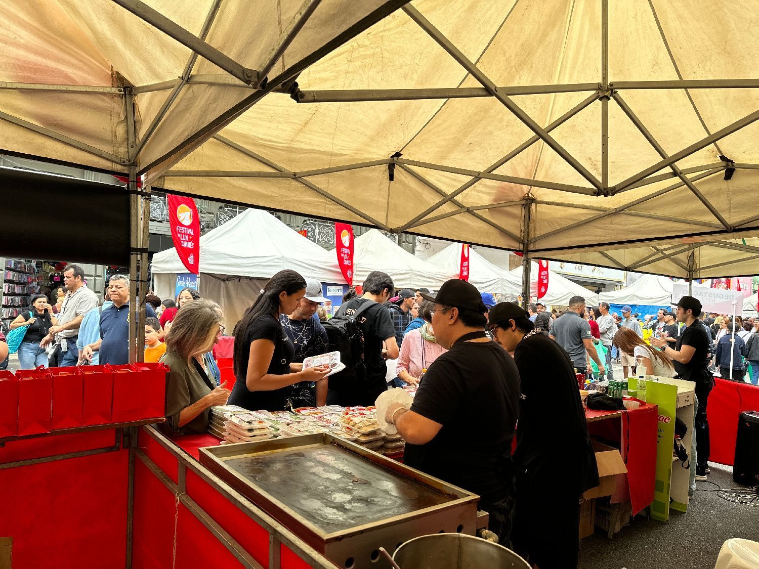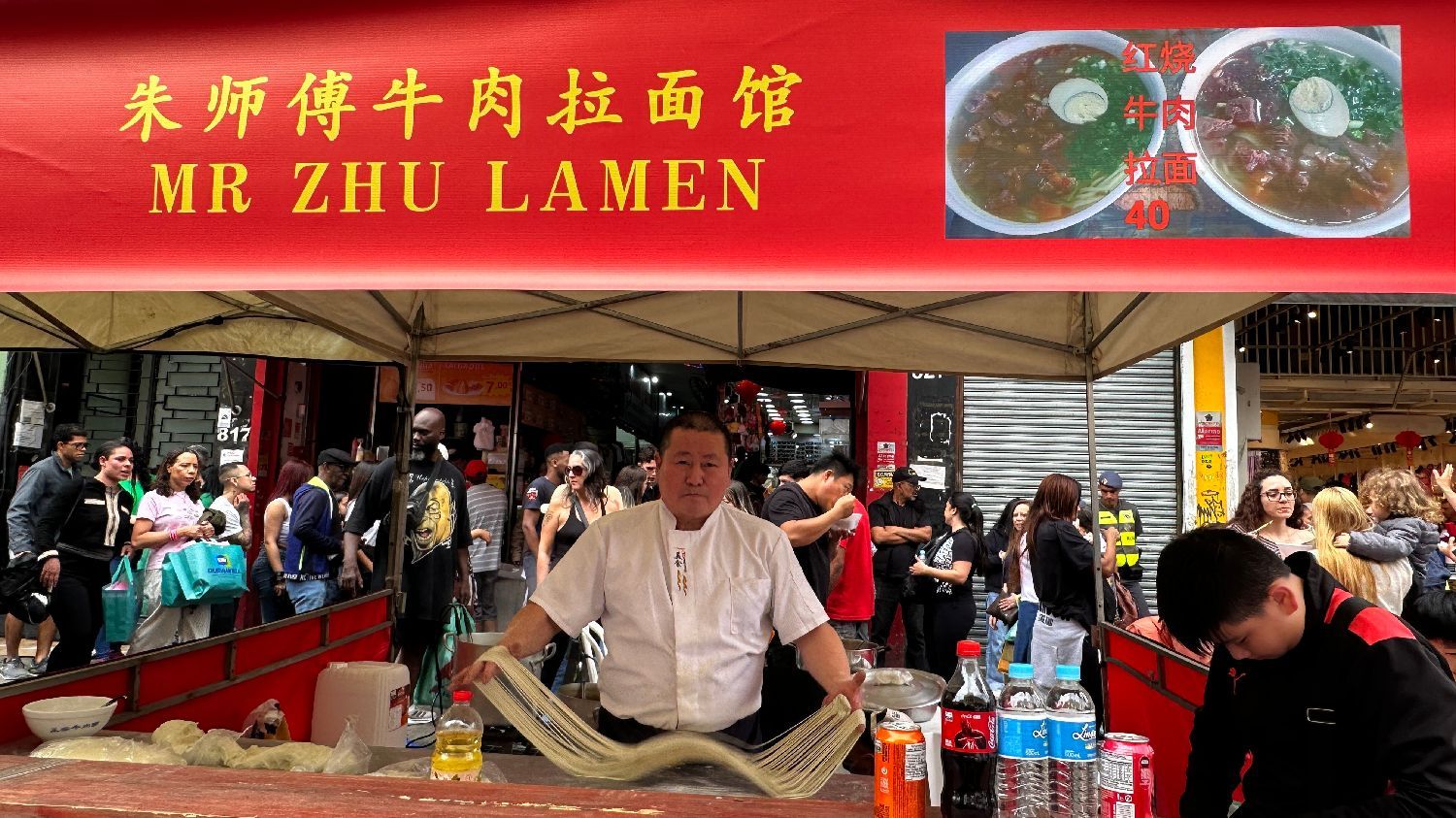 节日的25街洋溢着浓浓的喜庆气氛。以两个红色彩虹门为界,近千米的长街上美食摊位、文化展区和表演舞台依次铺陈。装饰着飞檐的舞台上,大红灯笼高高悬挂,“欢聚中秋”(Festival da Lua Chinesa)的标识格外醒目,处处洋溢着浓郁的东方韵味,吸引无数民众驻足拍照。