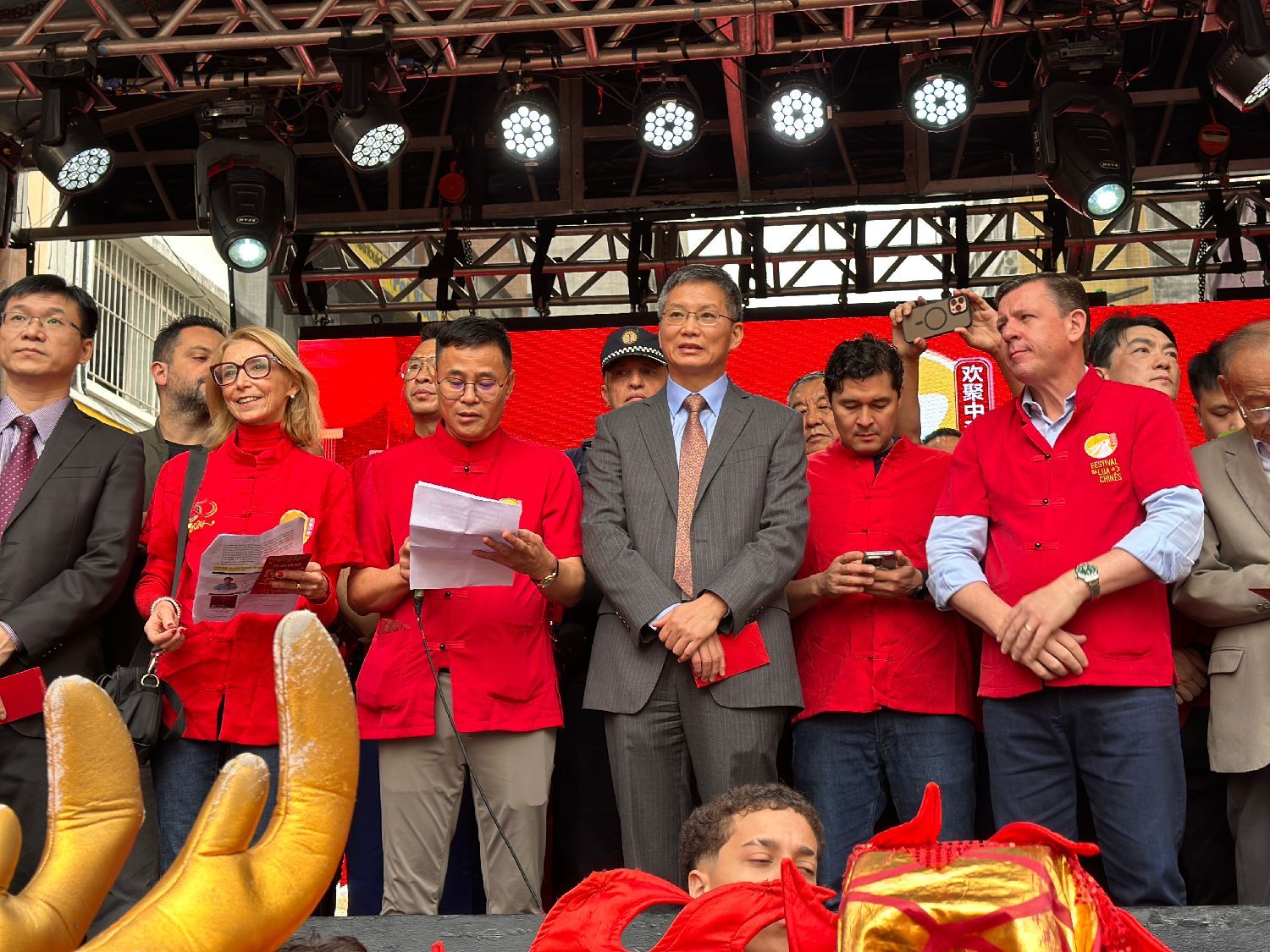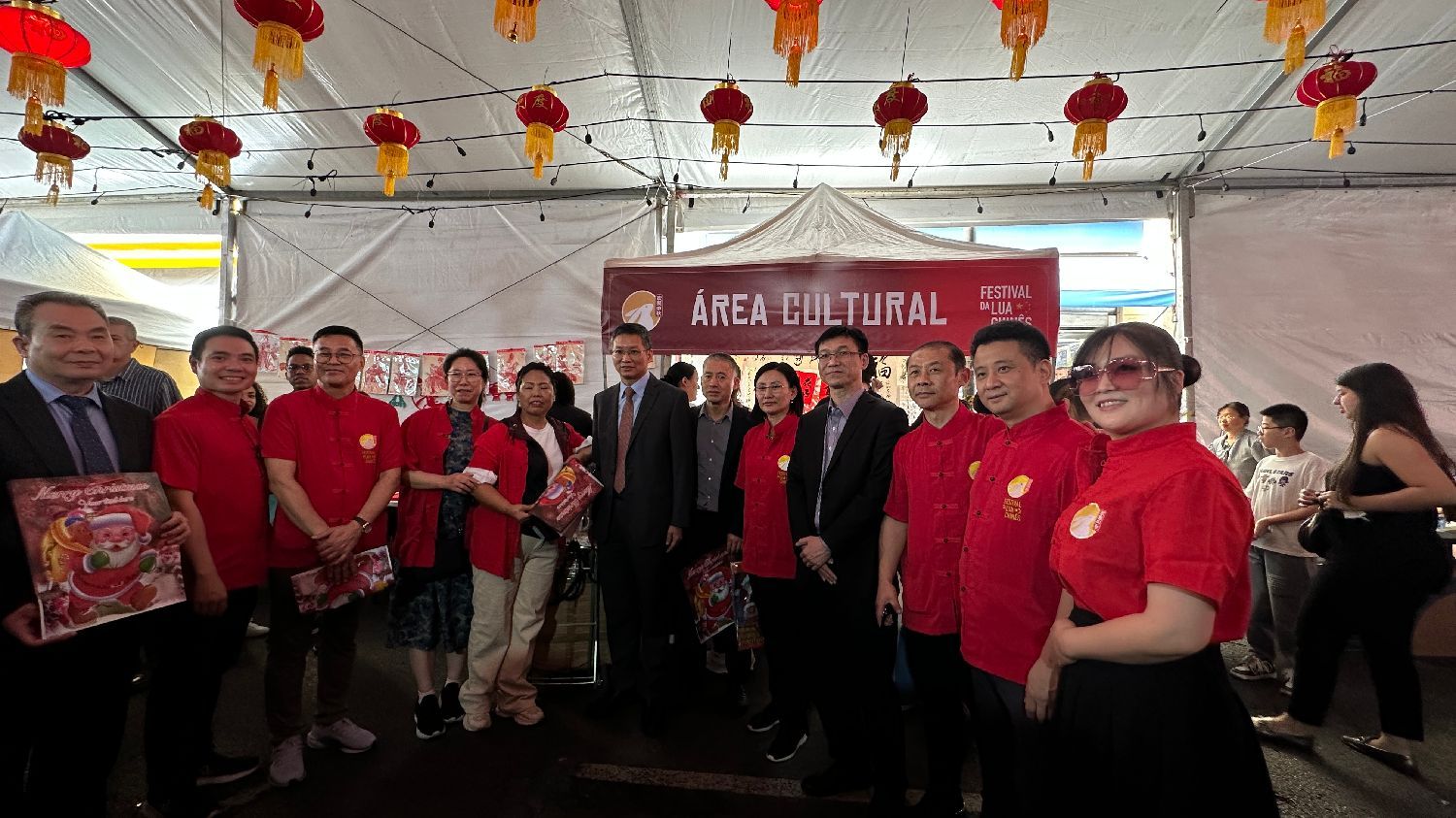 【南美侨报特约记者庄沂圣保罗报道】10月4日,第三届“欢聚中秋”嘉年华在巴西圣保罗著名商业街—25街隆重开幕。中国驻圣保罗总领事余鹏、领侨处侨务领事李晓明、巴西华人协会会长叶周永,以及“欢聚中秋”嘉年华主办侨团代表杨志芳、宋玉美、林旭、章晓红、诸诗琦、杜青松、李锦辉及活动协办单位负责人、圣保罗侨社代表出席开幕式。圣保罗市政府官员、巴西政商界代表与数以万计的华侨华人、巴西民众齐聚一堂,共襄这一融合中华传统文化与巴西风情的年度文化盛会。