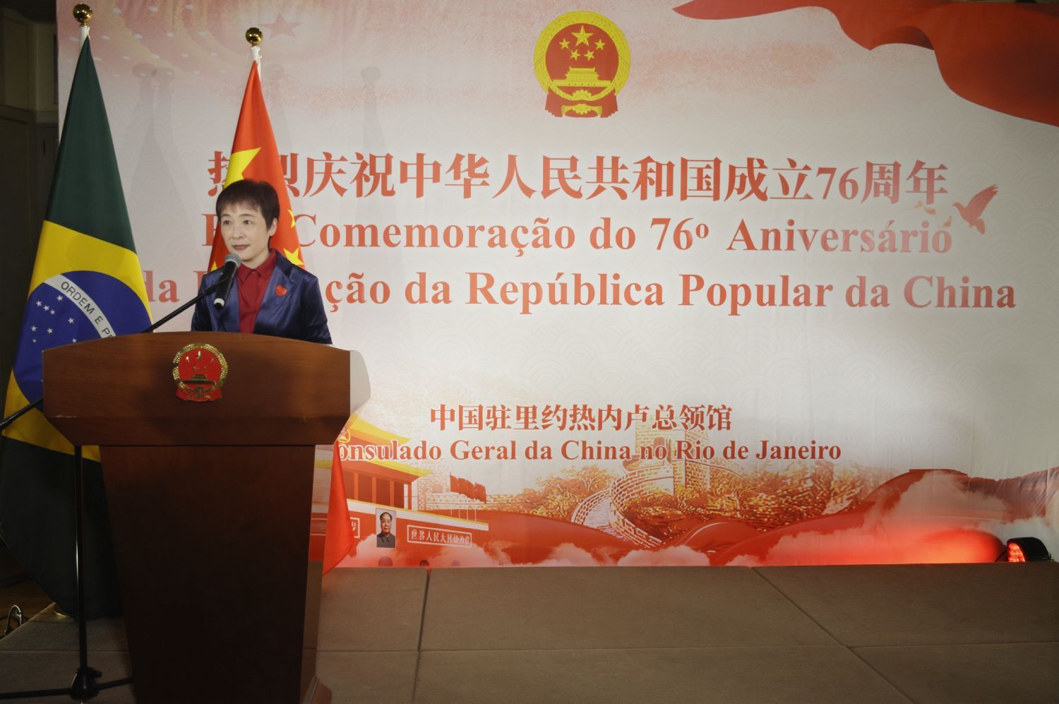 【南美侨报特约记者陈妤汎里约热内卢报道】10月9日,为庆祝中华人民共和国成立76周年,中国驻里约热内卢总领馆在里约市长宫举办国庆招待会。中国驻里约总领馆总领事田敏、里约市国际关系局局长伊兰·库珀斯坦等领区内各州市政府官员、各国驻里约领事机构代表、侨团侨领、中资企业、媒体、孔子学院教师及留学生代表等约300余人出席此次活动。