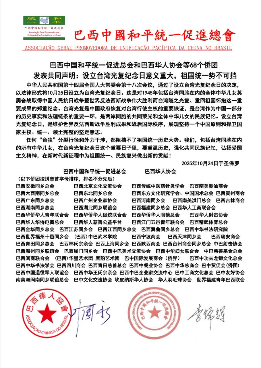巴西中国和平统一促进总会和巴西华人协会等68个侨团发表共同声明:设立台湾光复纪念日意义重大,祖国统一势不可挡