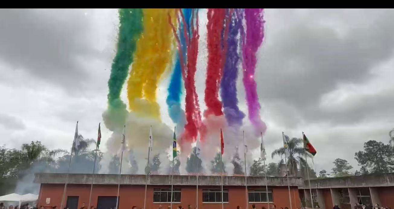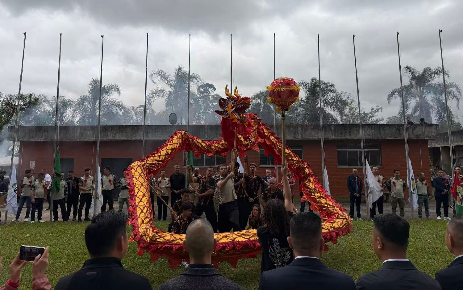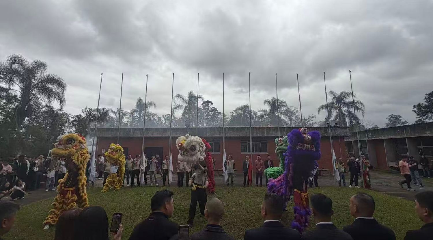 上午11时,典礼在热烈的舞龙舞狮表演中拉开序幕。随后举行了庄严的升旗仪式,中巴两国国歌响彻会场,中国国旗、巴西国旗以及各侨团会旗依次升起,漫天绽放的礼花将现场气氛推向高潮,全体嘉宾的大合影定格了这一重要时刻。