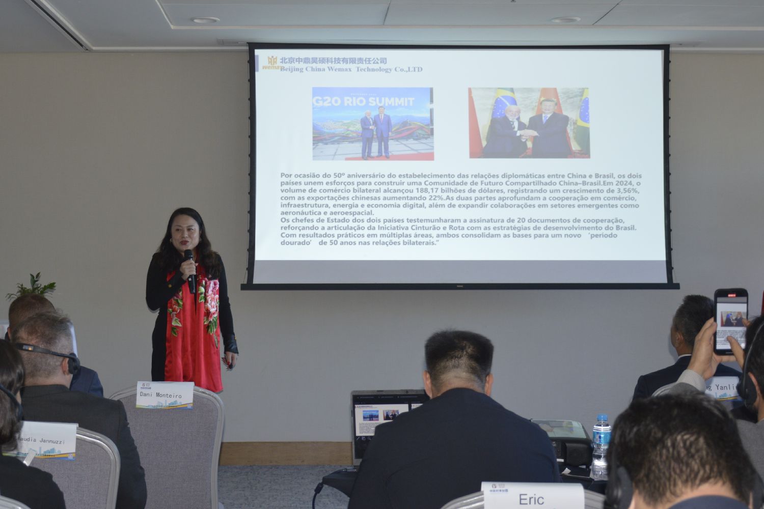 北京中鼎昊硕科技有限责任公司董事长王霞介绍了公司在丰台区的发展情况及在中巴合作中的积极贡献。作为国家级高新技术企业,中鼎昊硕长期致力于数字化城市建设与科技创新。曾与巴西前总统探讨过资源卫星与亚马逊计划,并多次在中国举办巴西主题活动,接待过巴西副总统以及石油、矿产等行业代表,积极推动中巴两国在科技与产业领域的交流合作。