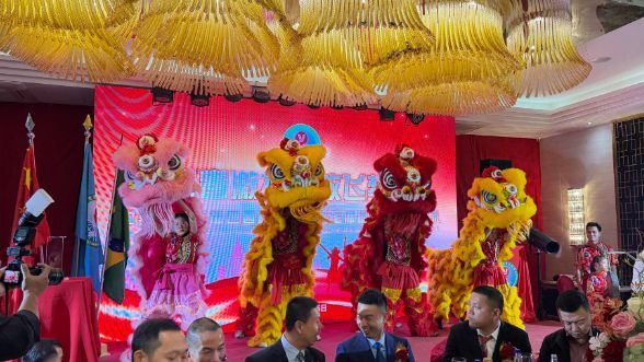 喜庆的舞狮表演率先登场,祥狮腾跃、锣鼓铿锵,瞬间点燃全场热烈氛围,为这场承前启后的盛会拉开序幕。全体来宾肃立致敬,中华人民共和国与巴西联邦共和国国歌先后奏响,两国国歌的旋律交融回荡,彰显了中巴友谊的深厚底蕴,为典礼奠定了庄严隆重的基调。