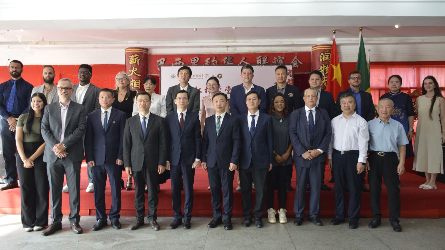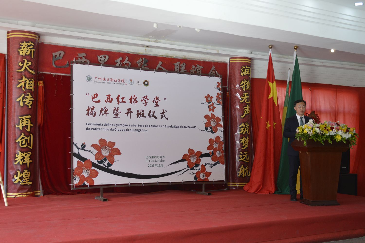 【南美侨报特约记者陈妤汎里约热内卢报道】11月22日,由广州城市职业学院、巴西里约热内卢州立大学、里约华人联谊会及新征程商务中心共同主办的巴西红棉学堂揭牌暨开班仪式在里约热内卢圆满举行。中国驻里约热内卢总领馆副总领事王海涛,广州市副市长胡浩,广州市委外办主任杨勇,广州城市职业学院副校长王军,里约热内卢州立大学副校长布鲁诺·罗德里格斯,里约州议员丹妮·蒙泰罗,中巴企业家委员会中方主席单位巴西中海油公司总经理黄业华,巴西里约华人联谊会会长陈秉文,以及巴西外贸商会联合会主席阿代尔·卡尔内罗等,政商文化界人士出席了本次活动。此外,活动还吸引了众多中文爱好者积极参与。