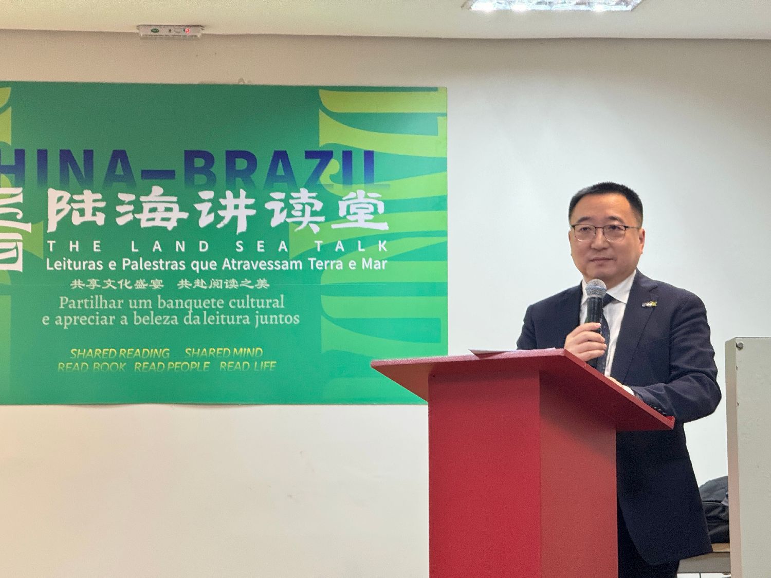 他随后谈到阅读的重要意义,并强调此次远渡太平洋来到巴西,正是希望“以书为媒结交朋友,以出版和阅读的力量推动陆海文明交流互鉴”。陆海叙事因共同阅读而更加生动,文明互鉴因陆海讲读堂而更具活力。他指出,文化交流从不是单向输出,而是双向滋养;从中国到巴西、从重庆到圣保罗、从长江到亚马逊,中巴两国正在以书为桥,书写陆海叙事下的文明交流新篇章。他介绍,“陆海讲读堂”作为重庆市自2024年12月精心打造的重要全民阅读品牌,每月邀请一位在中国具有影响力与公共价值的作者进行讲座,目前已举办14期。此次圣保罗活动是“陆海讲读堂”的海外首站,其核心目标是推动“陆海之阅”共同阅读行动,通过共同阅读深化理解、推进文明互鉴,让世界读懂中国,也让中国读懂世界。马然希最后特别感谢圣保罗州立大学孔子学院、中巴双方出版社代表及多位专家学者的积极参与。他表示,相信在各界共同努力下,中巴文化交流将不断深化,文明互鉴的桥梁将更加坚固。