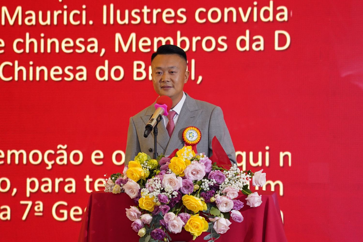 第七届会长邱垚伟致辞说,今天我站在这里,心中充满感恩。感谢全体会员将会长这一重任交予我。这份信任,是荣耀,更是沉甸甸的责任。感谢历届会长叶王永、周海军和理监事们打下的坚实基础,也感谢总领馆一直以来的关怀指导,巴西华人协会以及各兄弟侨团始终如一的鼎力支持。回首过往,我们满怀自豪。从“水立方杯”的天籁之音唱响中华文化,到“曼巴杯”、“亚文青联杯”的赛场汗水挥洒青春激情,青年会早已成为巴西侨界一张清新的文化名片,一个充满活力的精神家园,我们将团结协作的精神刻入青年心间,将友爱奉献的温暖传递到社区角落。